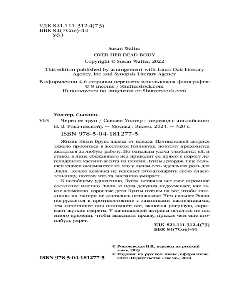Через её трупВ данный момент этот товар отсутствует в продаже. Возможно, у нас найдется аналогичный или похожий товар здесь. Серия: Tok. Мировые хиты Сьюзен Уолтер Жизнь Эшли Брукс далека от идеала. Начинающей актрисе тяжело пробиться в жестоком Голливуде, поэтому приходится хвататься за любую работу. Но однажды удача улыбается ей, и судьба в лице сбежавшего пса приводит ее прямо к порогу легендарного кастинг-агента на пенсии Луизы Джордж. Еще большей удачей оказывает то, что у Луизы есть идеальная роль для Эшли. Только девушка не успевает отблагодарить свою спасительницу, потому что та внезапно умирает... |