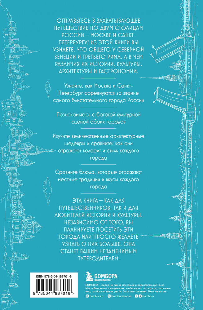 💳 Оплатить за товар можно при получении 🇰🇿 Есть бесплатная доставка по Казахстану от 1 дня 🎁 Копите бонусы с каждой покупки Серия: Москва. Лучший город Земли Шаурма или шаверма? Парадная или подъезд? Бордюр или поребрик? И почему это вообще кому-то важно? Эта книга ответит вам на все волнующие вопросы о вечном соперничестве Москвы и Санкт-Петербурга! С ее помощью вы заглянете в сокровенные закутки истории Москвы и Санкт-Петербурга, а именно их совместной истории непримиримого соперничества: культурные противоречия и общий контекст множества эпох — все это ловко передано автором как с помощью подробных исторических справок об основателях и архитекторах двух столиц, так и благодаря находчивым лирическим отступлениям о привидениях, гастрономии и футболе. Ну и, конечно же, куда без памятников и музеев, а также наглядных иллюстраций. |