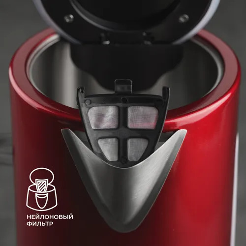 Эргономичная ручка, закрытый нагревательный элемент сделают эксплуатацию прибора еще проще и комфортнее. Съемный нейлоновый фильтр предотвратит попадание накипи в напиток. Стильный красный цвет станет удачным решением на кухне!