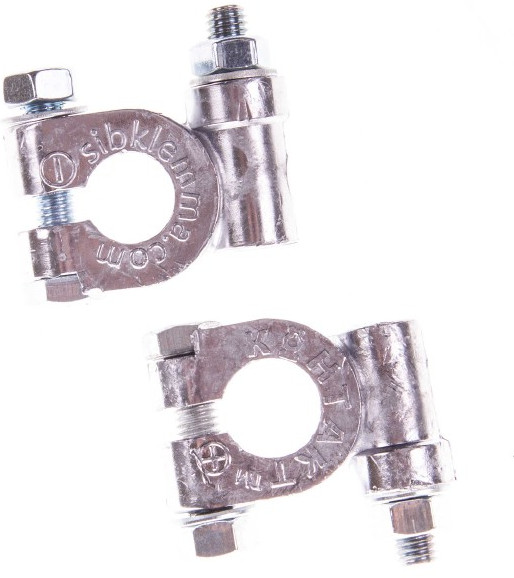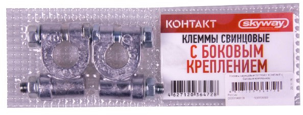 Клеммы свинцовые SKyway Контакт с боковым креплением - набор клемм «+» «-» используется для аккумуляторных батарей авто. Крепление провода боковое, осуществляется при помощи болта. Клемма изготовлена из свинца и выполняет работу не только крепления проводов, но и в некотором роде «проводника» и предохранителя. Свинцовая клемма обладает достаточной электропроводимостью и пластичностью.