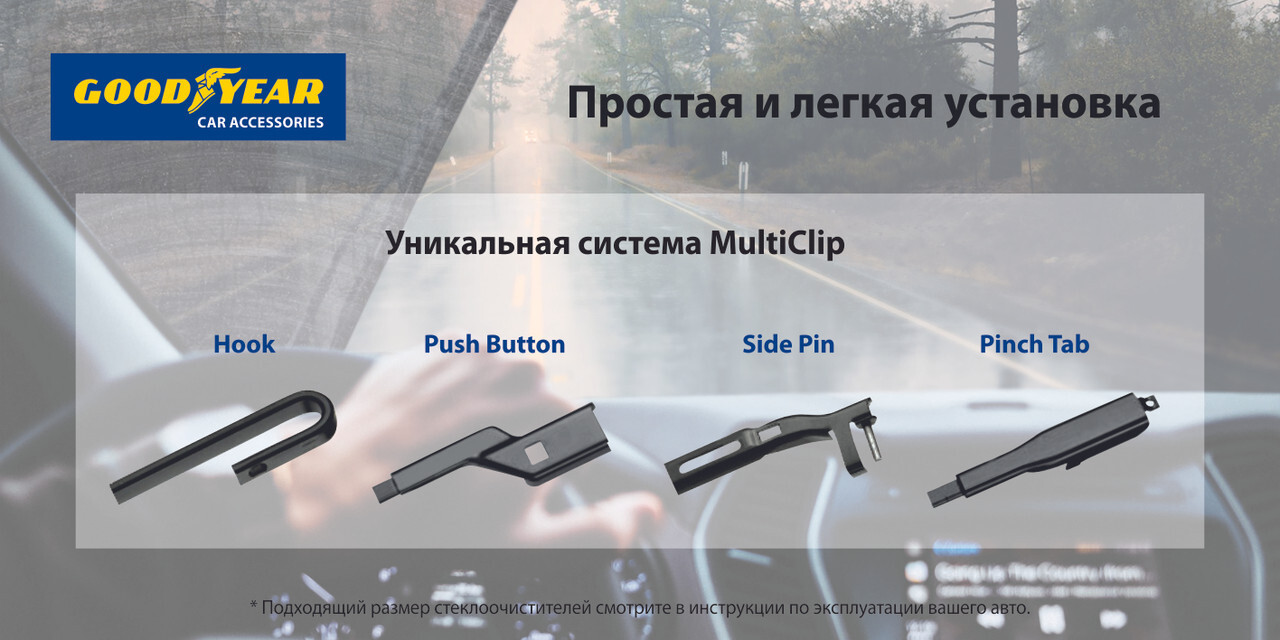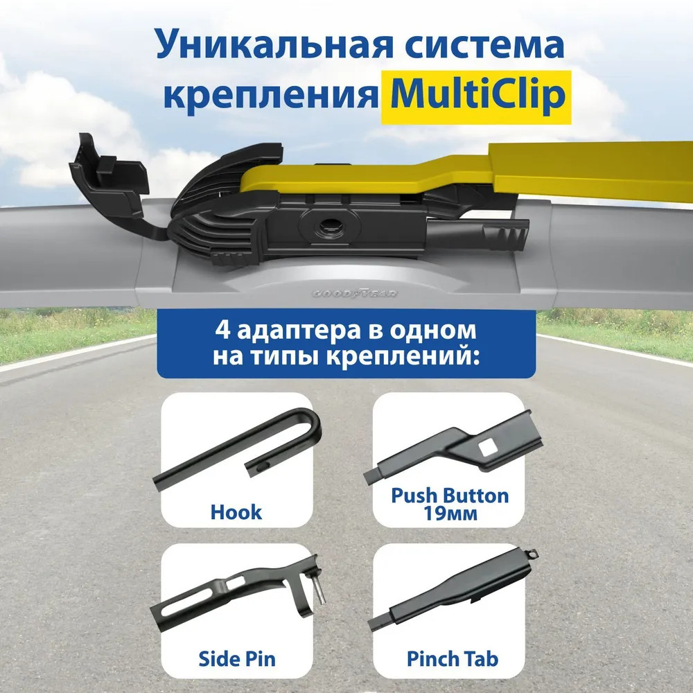 • система крепления MultiСlip позволяет установить щётку в считанные минуты без адаптеров и сложных инструкций. Подойдёт для креплений Hook, Push Button, Side Pin и Pinch Tab;
