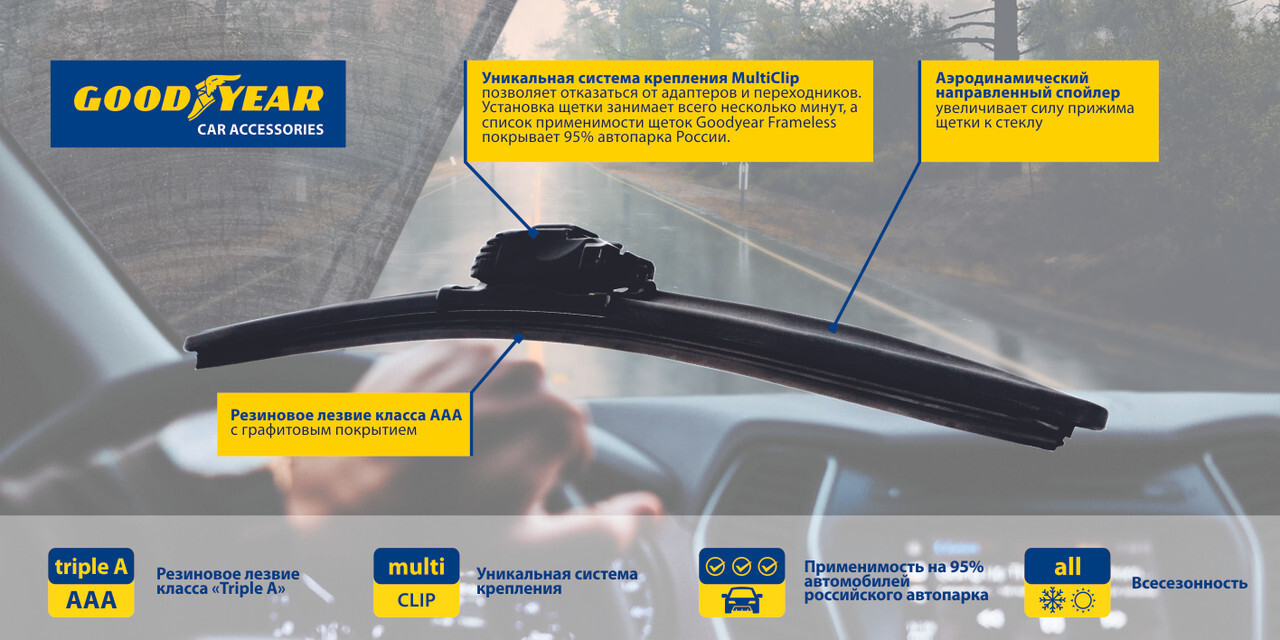 Бескаркасная щётка стеклоочистителя Goodyear «Frameless» подходит для автомобилей с левым рулём. Преимущества щётки стеклоочистителя Goodyear «Frameless» 14″ (36 см):