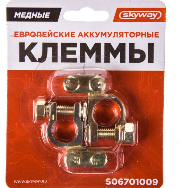 Клеммы медные Skyway европейскиt — клеммы для аккумулятора. Аккумуляторные клеммы являются важной составляющей автомобиля, помогающей нормально функционировать автомобильному аккумулятору. Изделие имеет отличную электропроводность. Изготовлена из качественной меди и стали.