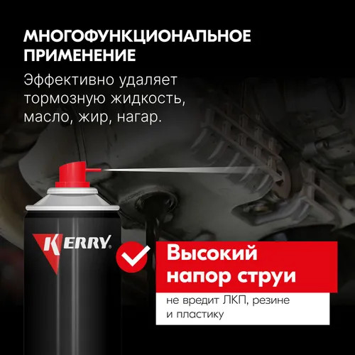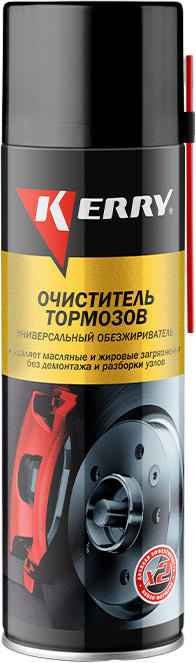 Очиститель деталей тормозов и сцепления (универсальный обезжириватель) Kerry — высокоэффективное средство для очистки тормозных колодок, барабанов, дисков, цилиндров, компонентов ABS и других деталей тормозных систем любых типов, а также деталей сцепления.