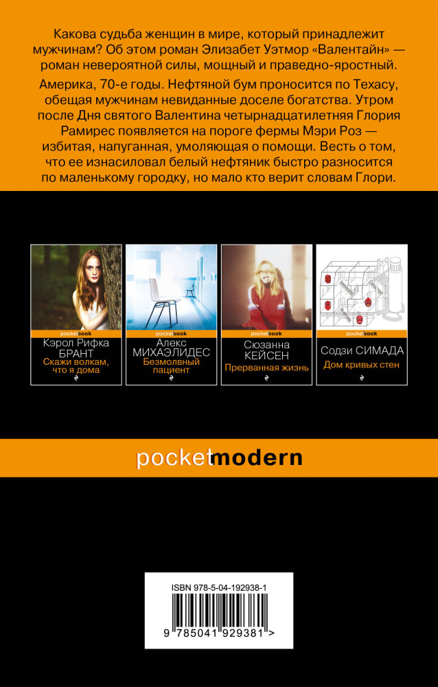 💳 Оплатить за товар можно при получении 🇰🇿 Есть бесплатная доставка по Казахстану от 1 дня 🎁 Копите бонусы с каждой покупки Серия: Pocket Book (обложка) Действие романа разворачивается в 70-е, в маленьком городке Одесса, штат Техас. Четырнадцатилетняя Глория Рамирез подверглась жестокому изнасилованию. «Валентайн» повествует о том, как на это происшествие отреагировали жители города, а в особенности — женщины. Женщины, угнетенные патриархатом, женщины, которые страдали от норм религии и политики, женщины, которых считали второсортными членами общества. Но то, что случилось с Глорией, заставит их переосмыслить свое положение и наконец начать бороться за справедливость. |