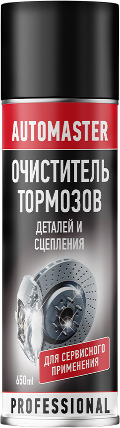Очиститель тормозов «Automaster» — предназначается для быстрой очистки и обезжиривания узлов тормозных систем и сцепления (колодок, барабанов, дисков, элементов АВС и др.) от масло-жировых загрязнений, тормозной жидкости и маслянистой дорожной пленки. Применение данного средства восстанавливает эффективную работу тормозных механизмов и сцепления, устраняет скрип тормозных колодок. Средство также предназначено для очистки и обезжиривания металлических деталей, индустриального оборудования и инструмента. Не оставляет на поверхности следов и разводов. ,не вызывает коррозию металлических деталей. Не содержит ацетон!