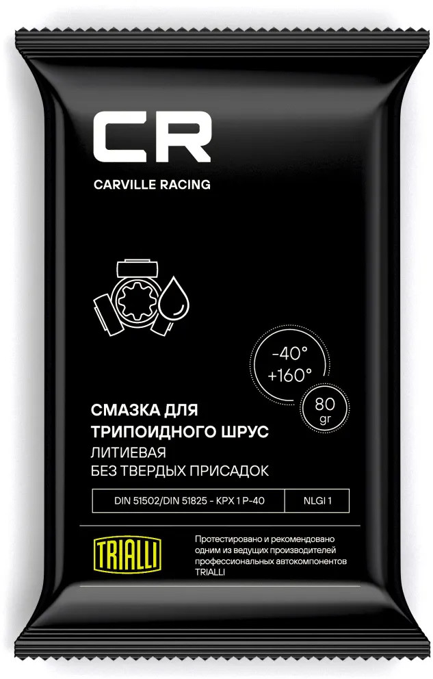 Смазка литиевая Carville Racing для трипоидного ШРУС - высокоэффективная комплексная пластичная литиевая смазка Carville Racing на основе масел высокой степени очистки. Не содержит твердых присадок, обладает высокими противозадирными, противоизносными и антикоррозийными свойствами. Обеспечивает длительный срок эксплуатации ШРУСа. Не содержит твердых присадок (графита, PTFE, дисульфид молибдена и др.), которые способны повредить игольчатые подшипники. Высокие антиокислительные свойства. Малый объём пакета удобен для выполнения небольших работ.