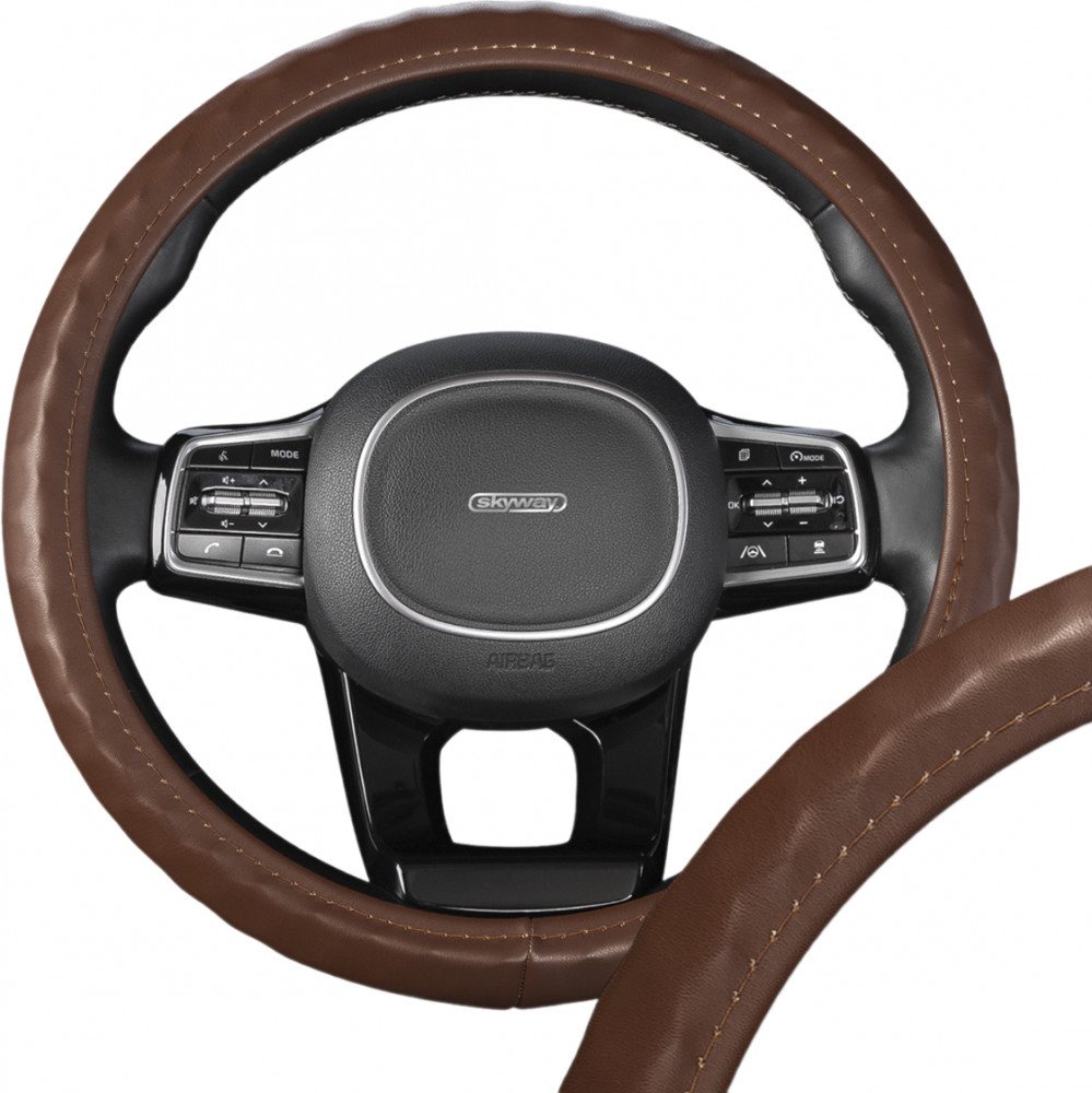 Оплетка SkywayTop-10 — современная классическая оплётка из экокожи. Скрывает имеющиеся потёртости и царапины, предотвращает появление новых. Обеспечивает надёжный контакт ладоней с ободом руля. Оплётка выполнена из высококачественной экокожи, которая сохраняет привлекательный внешний вид в течение длительного времени, проста в уходе, износостойкая. За счет многослойной структуры не нагревается при воздействии солнечных лучей, в зимнее время нехолодная на ощупь. Применение инновационных материалов на внутренней стороне оплетки исключает её проскальзывание. Аккуратно выполненные швы — гарантия высокой долговечности.