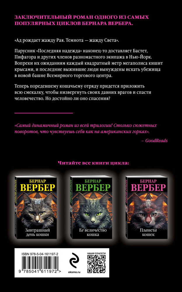 Планета кошекВ данный момент этот товар отсутствует в продаже. Возможно, у нас найдется аналогичный или похожий товар здесь. Серия: Бернар Вербер (новая эконом-серия) Парусник «Последняя надежда» наконец-то доставляет Бастет, Пифагора и других членов разномастного экипажа в Нью-Йорк. Вопреки их ожиданиям, каждый квадратный метр мегаполиса кишит крысами, и последние выжившие люди вынуждены искать убежища в новой башне Всемирного торгового центра. Теперь поредевшему кошачьему отряду придется приложить всю смекалку, чтобы низвергнуть своих давних врагов и спасти человечество. Но достойно ли оно спасения? |