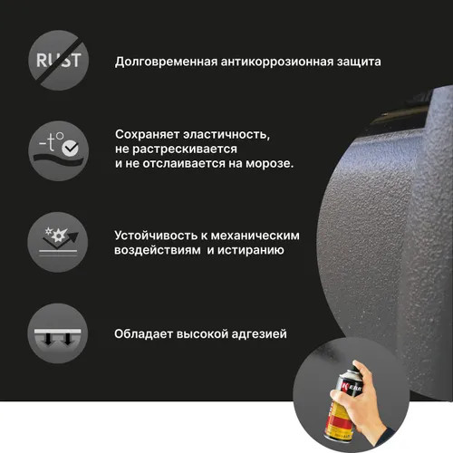 ® с эффектом шагрени KR-971 для восстановления текстурных покрытий на новых и ремонтируемых деталях автомобилей (колесные арки, пороги, крылья и т. п.) и создания долговременной защиты от летящих камней и песка, создающих интенсивную абразивную нагрузку. Способно предотвращать повреждения элементов нижней части кузовов легковых автомобилей и прочих транспортных средств. Обладает хорошей адгезией и звукоизоляционными свойствами, устойчиво к перепадам температур, сохраняет эластичность в холодное время года, не растрескивается и не отслаивается на морозе. Быстро сохнет, после высыхания может быть окрашено большинством эмалей.