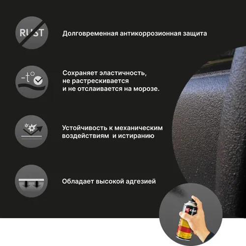 ® с эффектом шагрени KR-971 для восстановления текстурных покрытий на новых и ремонтируемых деталях автомобилей (колесные арки, пороги, крылья и т. п.) и создания долговременной защиты от летящих камней и песка, создающих интенсивную абразивную нагрузку. Способно предотвращать повреждения элементов нижней части кузовов легковых автомобилей и прочих транспортных средств. Обладает хорошей адгезией и звукоизоляционными свойствами, устойчиво к перепадам температур, сохраняет эластичность в холодное время года, не растрескивается и не отслаивается на морозе. Быстро сохнет, после высыхания может быть окрашено большинством эмалей.