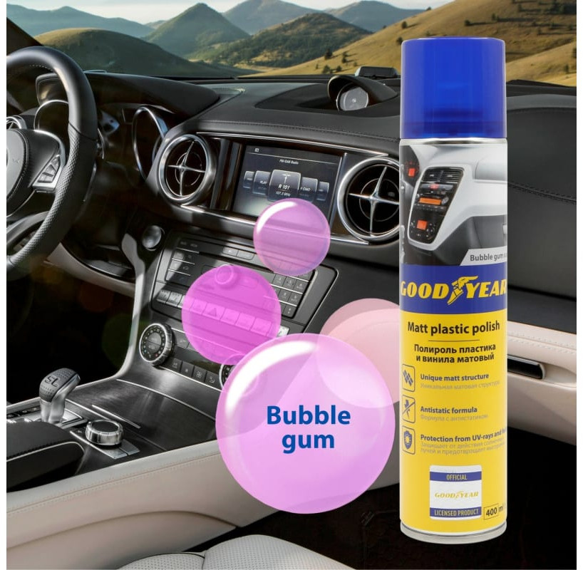 Матовый полироль пластика Goodyear, аэрозоль применяется для ухода за пластиковыми, резиновыми и виниловыми поверхностями интерьера автомобиля. Бережно удаляет загрязнения и полирует, возвращая элементам яркий цвет и создает эффектное матовое покрытие. Средство не оставляет липкого жирного следа. Благодаря антистатическим составляющим полироль защищает обработанную поверхность от пыли на длительный срок.