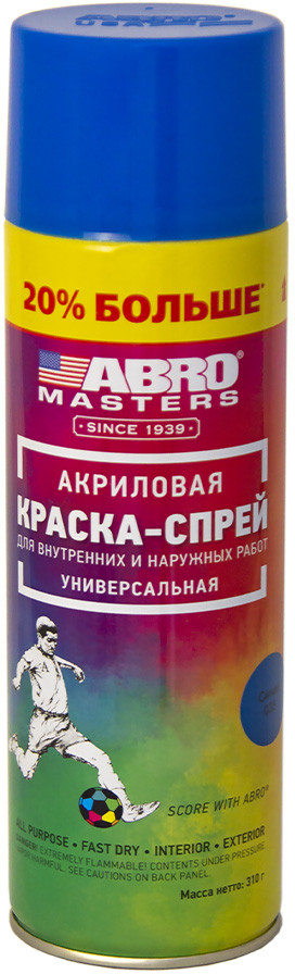 Краска-спрей Abro Masters — применяется для окраски металлических и деревянных поверхностей различных предметов как при внутренних (домашних), так и при наружных работах. После высыхания краска-спрей не токсична.