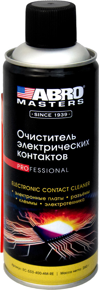 Очиститель электрических контактов Abro Masters — средство для очистки электрических контактов в аэрозольном баллоне используется для удаления масла, жира, грязи, окислов, влаги с электрических контактов, переключателей, клемм, розеток, электроплат, измерительных приборов и т. д. Обеспечивает защиту контактов от окисления и коррозии, предотвращает ухудшение электросигнала, быстро испаряется и не оставляет сухого остатка, безопасен для резины и большинства пластмасс, не содержит силиконов. Идеально подходит для электрических блоков и контактов в автомобиле и дома, компьютеров, аудио- и видеотехники, а также любых других электрических приборов и устройств.