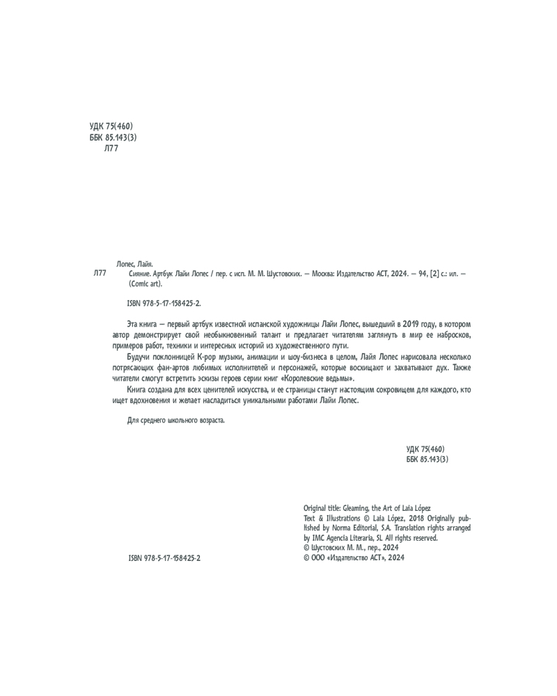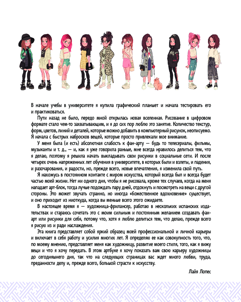 💳 Оплатить за товар можно при получении 🇰🇿 Есть бесплатная доставка по Казахстану от 1 дня 🎁 Копите бонусы с каждой покупки Серия: Comic art Эта книга — первый артбук известной испанской художницы Лайи Лопес, вышедший в 2019 году, в котором автор демонстрирует свой необыкновенный талант и предлагает читателям заглянуть в мир ее набросков, примеров работ, техники и интересных историй из художественного пути. |
