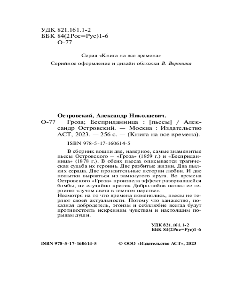 В данный момент этот товар отсутствует в продаже. Возможно, у нас найдется аналогичный или похожий товар здесь. Серия: Книга на все времена (нов/м) В сборник вошли две, наверное, самые знаменитые пьесы Островского — «Гроза» (1859 г.) и «Бесприданница» (1878 г.). В обеих пьесах описывается трагическая судьба их героинь. Две разбитые жизни. Два пылких сердца. Две пронзительные истории любви. И две попытки вырваться из замкнутого круга. Во времена Островского «Гроза» произвела эффект разорвавшейся бомбы, не случайно критик Добролюбов назвал ее героиню «лучом света в темном царстве».