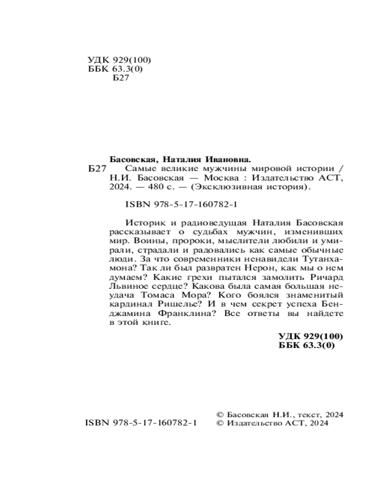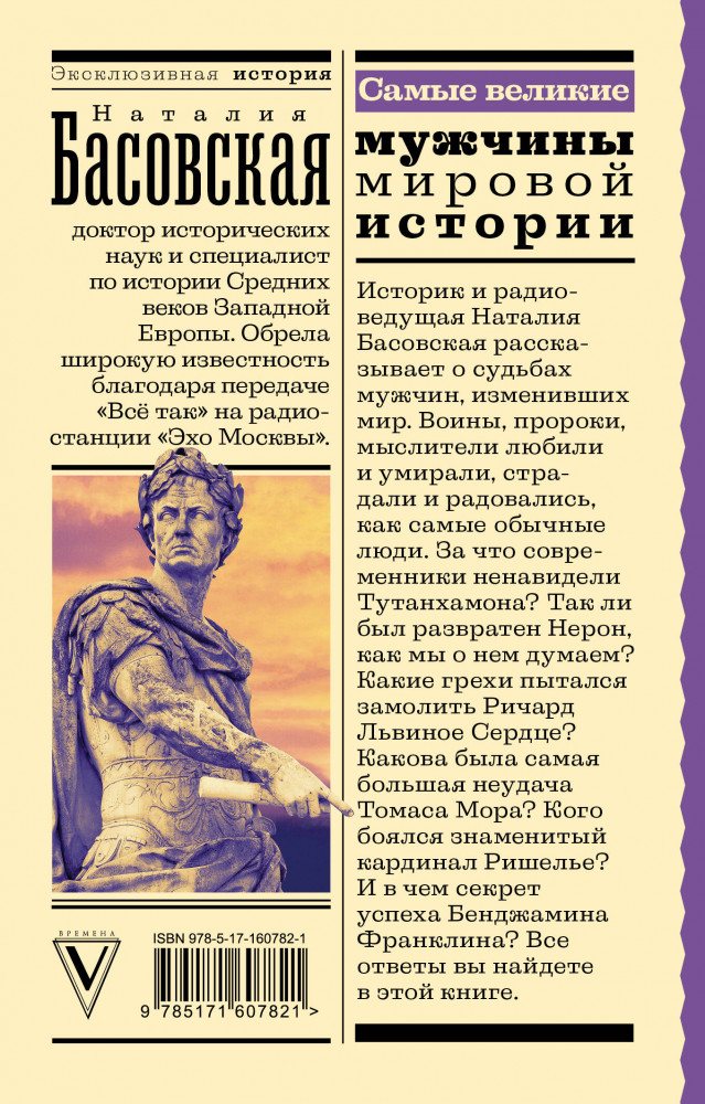 💳 Оплатить за товар можно при получении 🇰🇿 Есть бесплатная доставка по Казахстану от 1 дня 🎁 Копите бонусы с каждой покупки Серия: Эксклюзивная история Историк и радиоведущая Наталия Басовская рассказывает о судьбах мужчин, изменивших мир. Воины, пророки, мыслители любили и умирали, страдали и радовались как самые обычные люди. За что современники ненавидели Тутанхамона? Так ли был развратен Нерон, как мы о нем думаем? Какие грехи пытался замолить Ричард Львиное сердце? Какова была самая большая неудача Томаса Мора? Кого боялся знаменитый кардинал Ришелье? И в чем секрет успеха Бенджамина Франклина? |