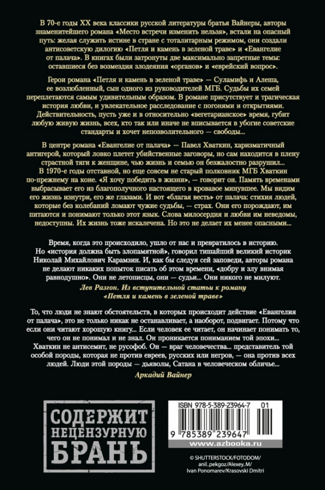 В данный момент этот товар отсутствует в продаже. Возможно, у нас найдется аналогичный или похожий товар здесь. Серия: Русская литература. Большие книги В 70-е годы ХХ века классики русской литературы братья Вайнеры, авторы знаменитейшего романа «Место встречи изменить нельзя», встали на опасный путь: желая служить истине в стране с тоталитарным режимом, они создали антисоветскую дилогию «Петля и камень в зеленой траве» и «Евангелие от палача». В книгах были затронуты две максимально запретные темы: оставшиеся без возмездия злодеяния «органов» и «еврейский вопрос»