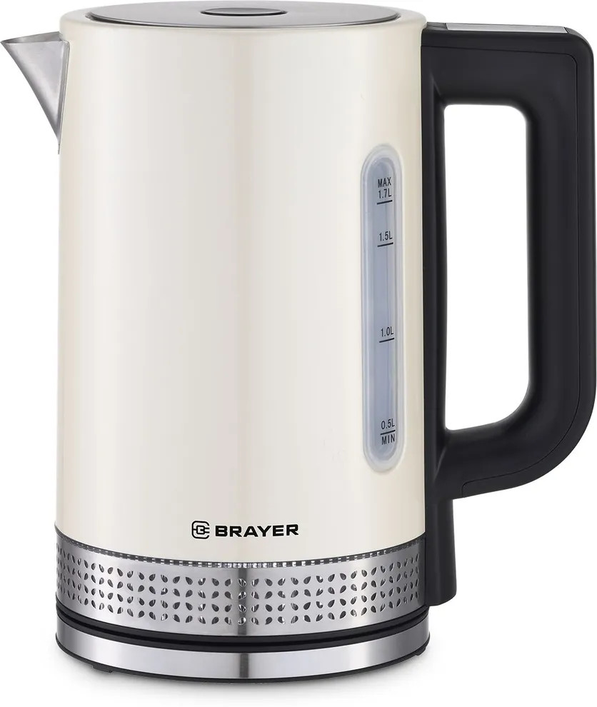 За счет скрытого нагревательного элемента мощностью 2200 Вт электрочайник BR1068 быстро доводит до кипения весь объем залитой внутрь воды. При включении чайника внутри загорается лампа подсветки. Модель автоматически отключается при закипании воды и поддерживает защиту от включения при отсутствии воды или ее слишком низком уровне.