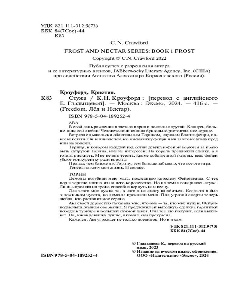 СтужаВ данный момент этот товар отсутствует в продаже. Возможно, у нас найдется аналогичный или похожий товар здесь. Серия: Freedom. Лёд и Нектар Страстное, пленяющее фэнтези о Короле Благих фейри и девушке, ставшей его музой, — новый цикл романов от К.Н. Кроуфорд! Для фанатов мрачных, жестоких и чарующих историй в духе Холли Блэк, Лекси Райан, Рейвен Кеннеди, и др.! Книга вошла в Топ-10 книг Амазон в жанрах «Фэнтези», «Истории о фейри»! |