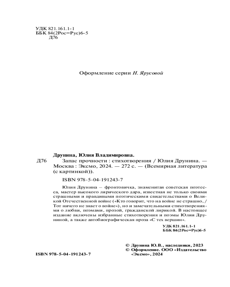 Серия: Всемирная литература (новое оформление) Юлия Друнина — фронтовичка, знаменитая советская поэтесса, мастер высокого лирического дара, известная не только своими страшными и правдивыми поэтическими свидетельствами о Великой Отечественной войне («Кто говорит, что на войне не страшно, / Тот ничего не знает о войне»), но и замечательными стихотворениями о любви, поэмами, прозой, гражданской лирикой. |