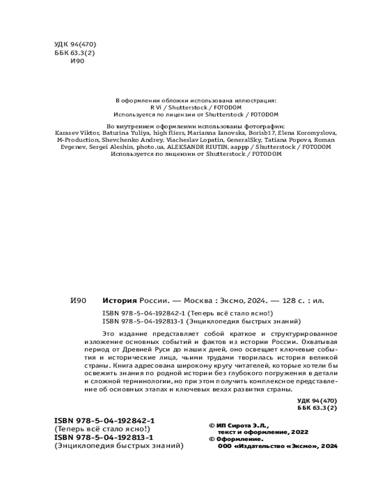 💳 Оплатить за товар можно при получении 🇰🇿 Есть бесплатная доставка по Казахстану от 1 дня 🎁 Копите бонусы с каждой покупки Серия: Энциклопедия быстрых знаний (обложка) «История России. Знания, которые не займут много места» — это увлекательный и полезный ресурс для всех, кто хочет освежить знания об истории России, но не знает, с чего начать. Перед вами сжатый и четко структурированный обзор истории России от рождения молодого государства Древней Руси до начала XXI века. Ключевые события, имена и даты изложены в простой и ясной форме, так что вы легко научитесь ориентироваться в отечественной истории. Четкая структура и доступный язык позволят быстро привести в порядок знания по истории России за небольшой срок, поэтому книга станет незаменимым помощником школьникам и студентам, а также всем, кому небезразличны прошлое, настоящее и будущее страны. |