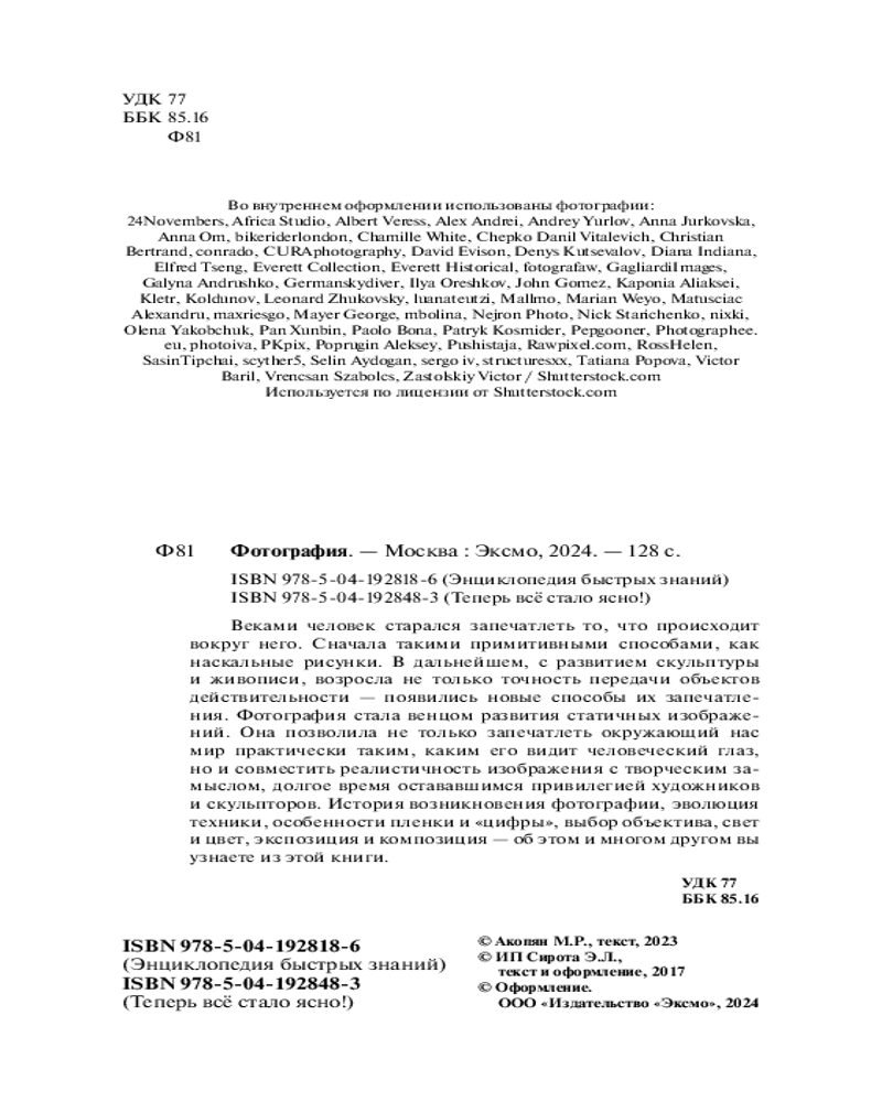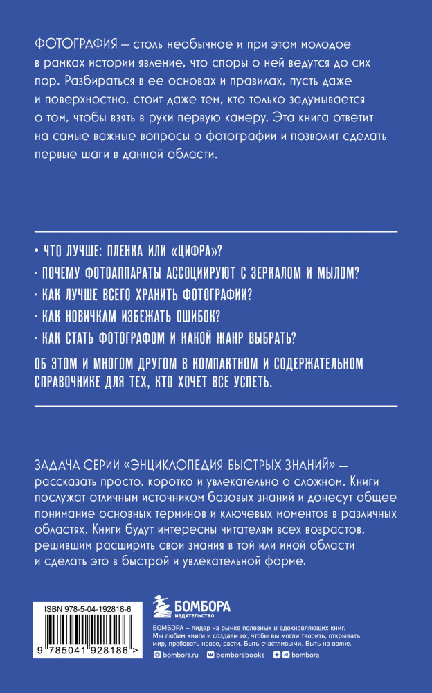 💳 Оплатить за товар можно при получении 🇰🇿 Есть бесплатная доставка по Казахстану от 1 дня 🎁 Копите бонусы с каждой покупки Серия: Энциклопедия быстрых знаний (обложка) Искусство фотографии — удивительное и относительно молодое явление в истории человечества, быстро снискавшее всеобщую популярность. Неиссякаемый источник споров и дискуссий, фотография с первых же опытов захватила исследователей, как теперь захватывает соцсети. Если вы только начинаете знакомиться с техникой фотографии, вы скорее всего столкнетесь с массой вопросов. Что выбрать: пленочную камеру или цифровой фотоаппарат? Как правильно хранить фотографии? Как избежать досадных ошибок? Какой жанр выбрать? |