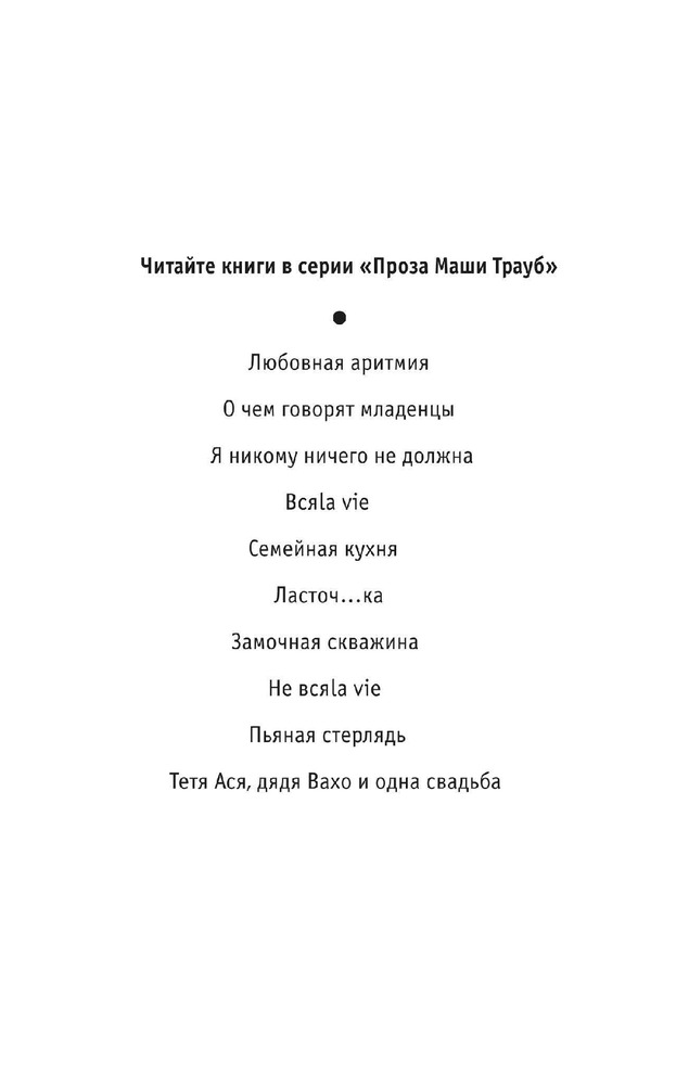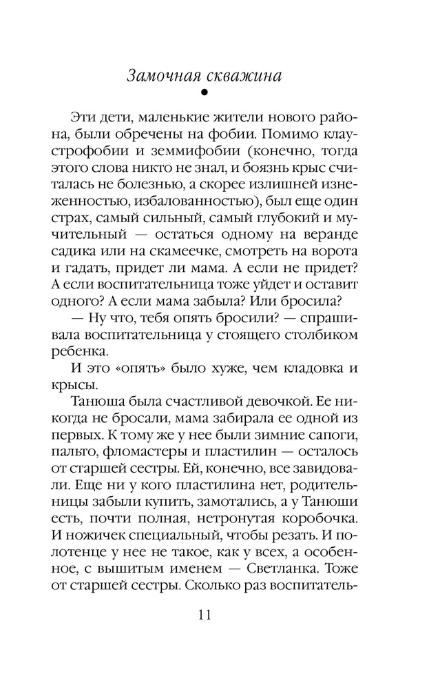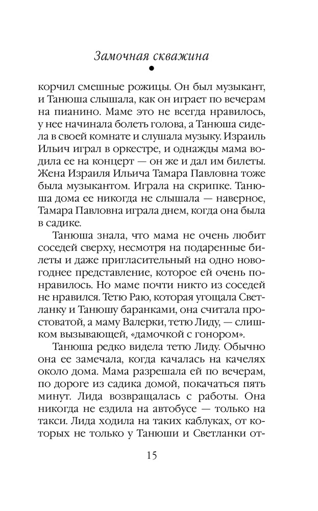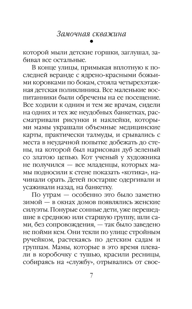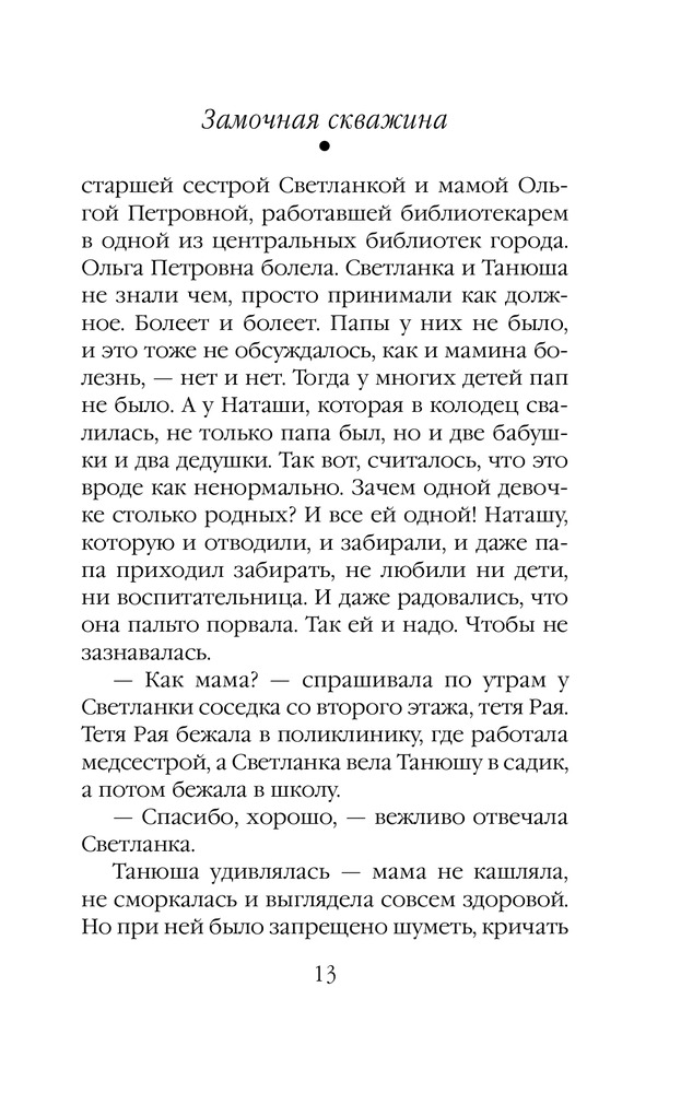 Замочная скважинаВ данный момент этот товар отсутствует в продаже. Возможно, у нас найдется аналогичный или похожий товар здесь. Серия: Проза Маши Трауб Я приехала в дом, в котором выросла. Долго пыталась открыть дверь, ковыряясь ключами в дверных замках. «А вы кто?» — спросила у меня соседка, выносившая ведро. «Я здесь живу. Жила», — ответила я. «С кем ты разговариваешь?» — выглянула |
