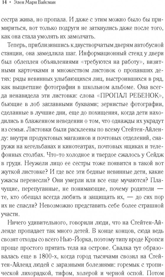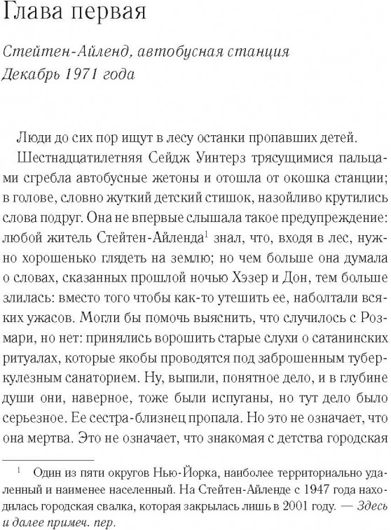 💳 Оплатить за товар можно при получении 🇰🇿 Есть бесплатная доставка по Казахстану 🎁 Копите бонусы с каждой покупки Серия: Memory Сейдж Уинтерз всегда знала, что ее сестра-близняшка Розмари немного не от мира сего: слишком остро воспринимает жизнь и нуждается в защите от враждебного мира. Розмари умерла от пневмонии шесть лет назад, и Сейдж, которой уже исполнилось шестнадцать, все еще по ней скучает. Девушка очень одинока: отец их бросил, мать погибла в автокатастрофе, а отчим Алан с радостью избавился бы от обузы в виде падчерицы. И тем страшнее становится для Сейдж открытие, что ее сестра вовсе не умерла, а была отправлена в Уиллоубрук, печально известное государственное учреждение для неполноценных детей, расположенное на Стейтен-Айленде. Ринувшаяся на поиски Розмари Сейдж и не подозревает, с какими ужасами ей предстоит столкнуться. |