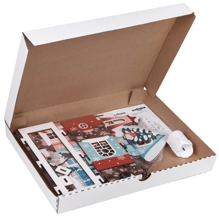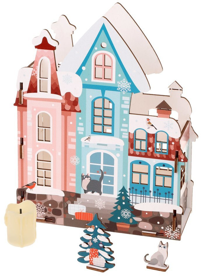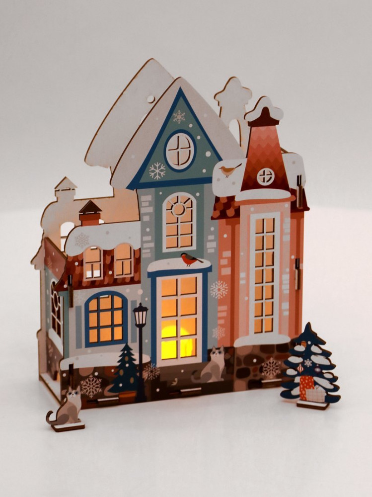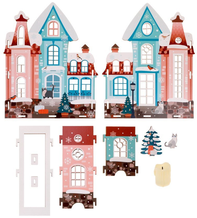 Хотите наполнить дом сказкой и создать праздничную атмосферу? Тогда соберите с ребенком декоративный деревянный домик, поместите внутрь LED-свечу (входит в набор; может отличаться от свечи, изображенной на фотографии), чтобы получился новогодний светильник. Изделие изготовлено из качественного материала — фанеры. Детали тщательно отшлифованы, печать нанесена прямо на фанеру, внутренняя сторона домика белая. Соберите все домики из серии, используйте дополнительные LED-гирлянды (не входят в комплект) и создайте неповторимую композицию.