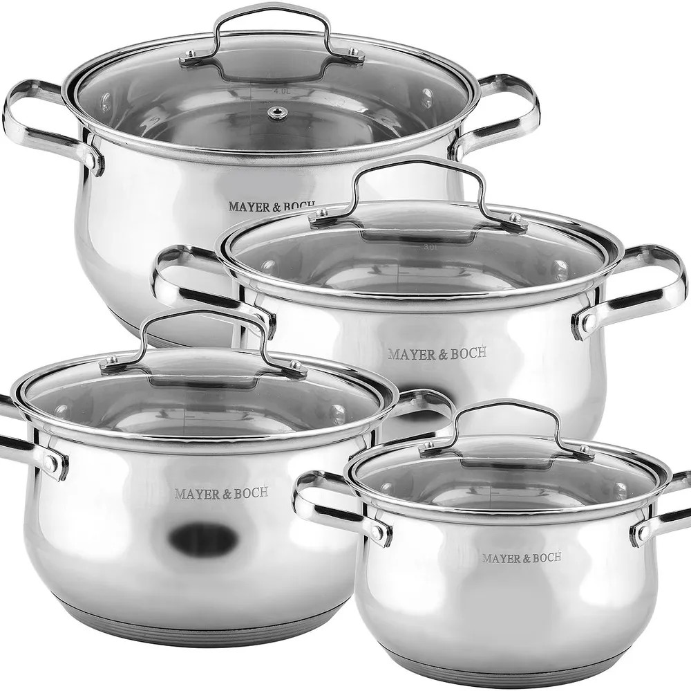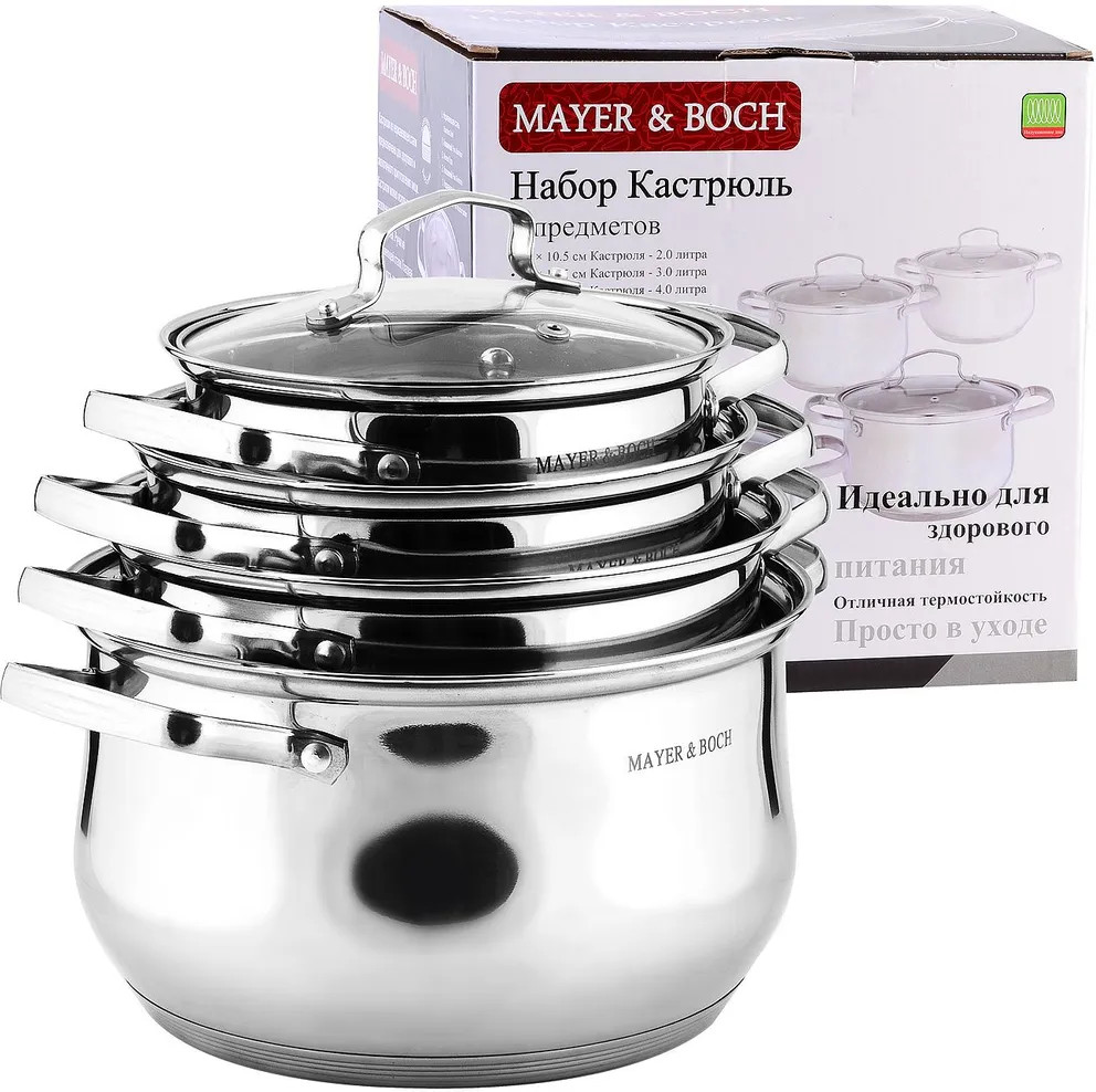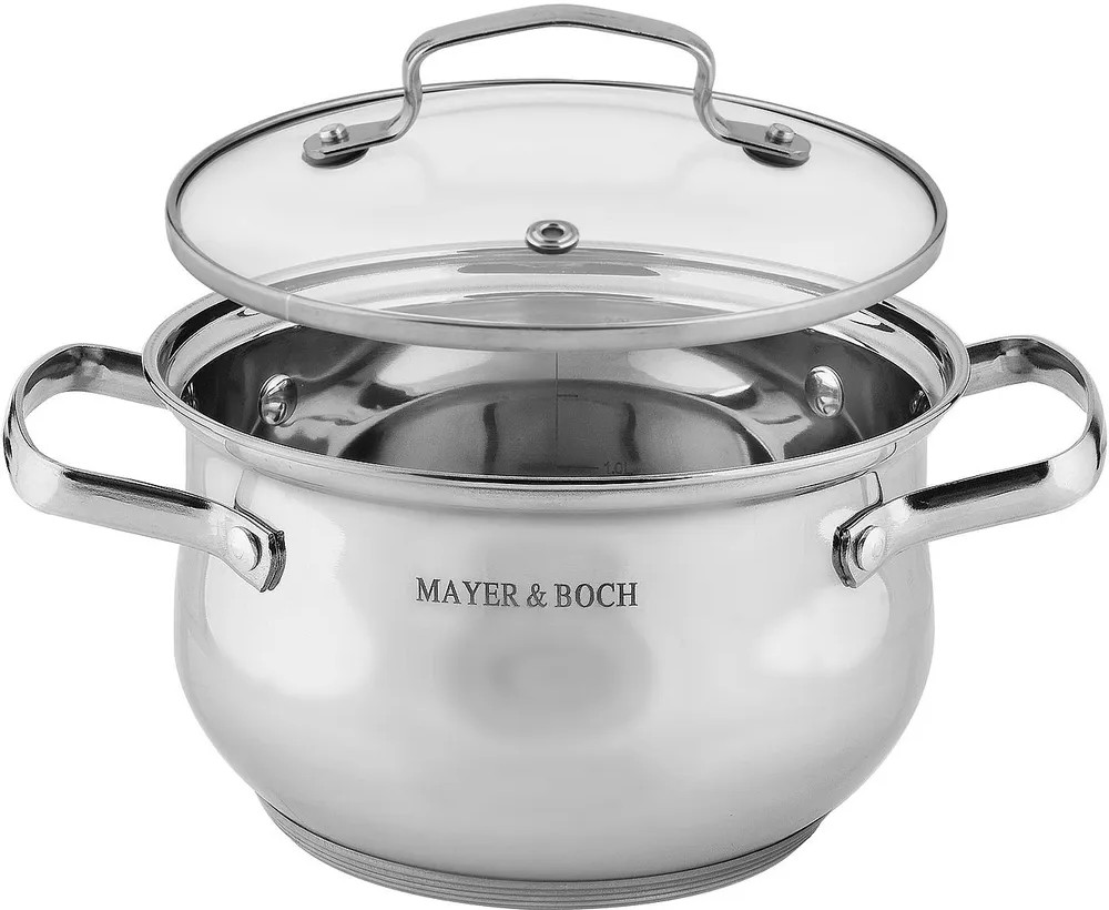 Набор кастрюль Mayer & Boch изготовлен из высококачественной многослойной нержавеющей стали, которая обеспечит быстрый нагрев продуктов и надолго сохранит тепло. Этот набор кастрюль предназначен для здорового и экологичного приготовления пищи. Удобные не нагревающиеся стальные ручки, стеклянная крышка с паровыпуском и стальным ободом, и зеркальная поверхность кастрюль с гравировкой, сделают приготовление пищи не только удобным и качественным, но и комфортным и эстетичным. Также изделия снабжены внутренней шкалой литража. Дно кастрюль индукционное, толщина стенок 0,43 мм.