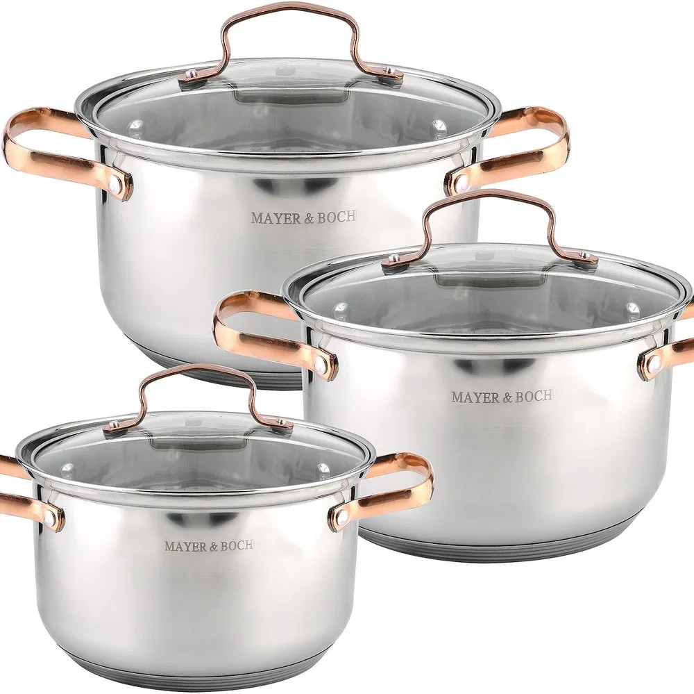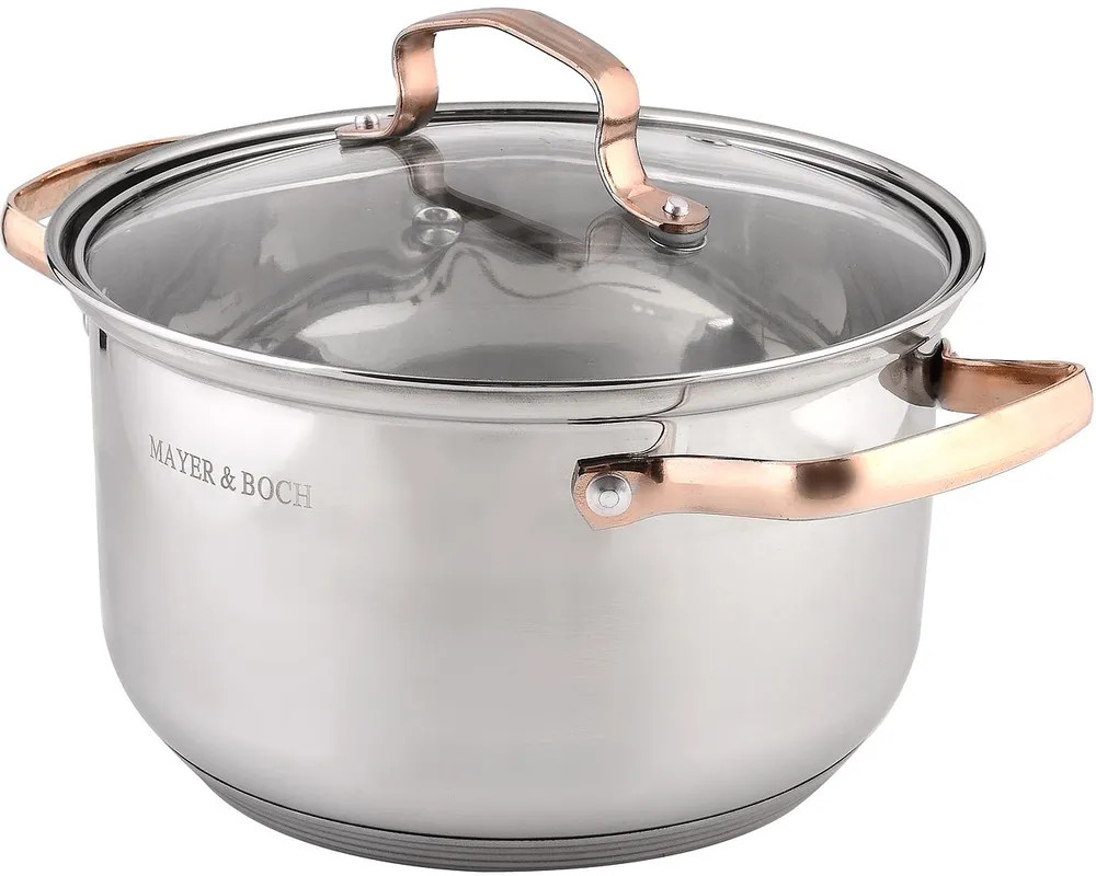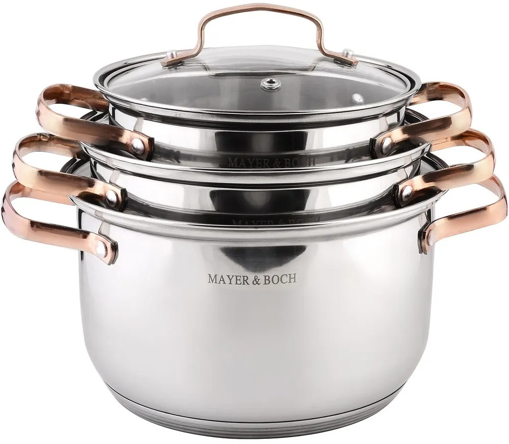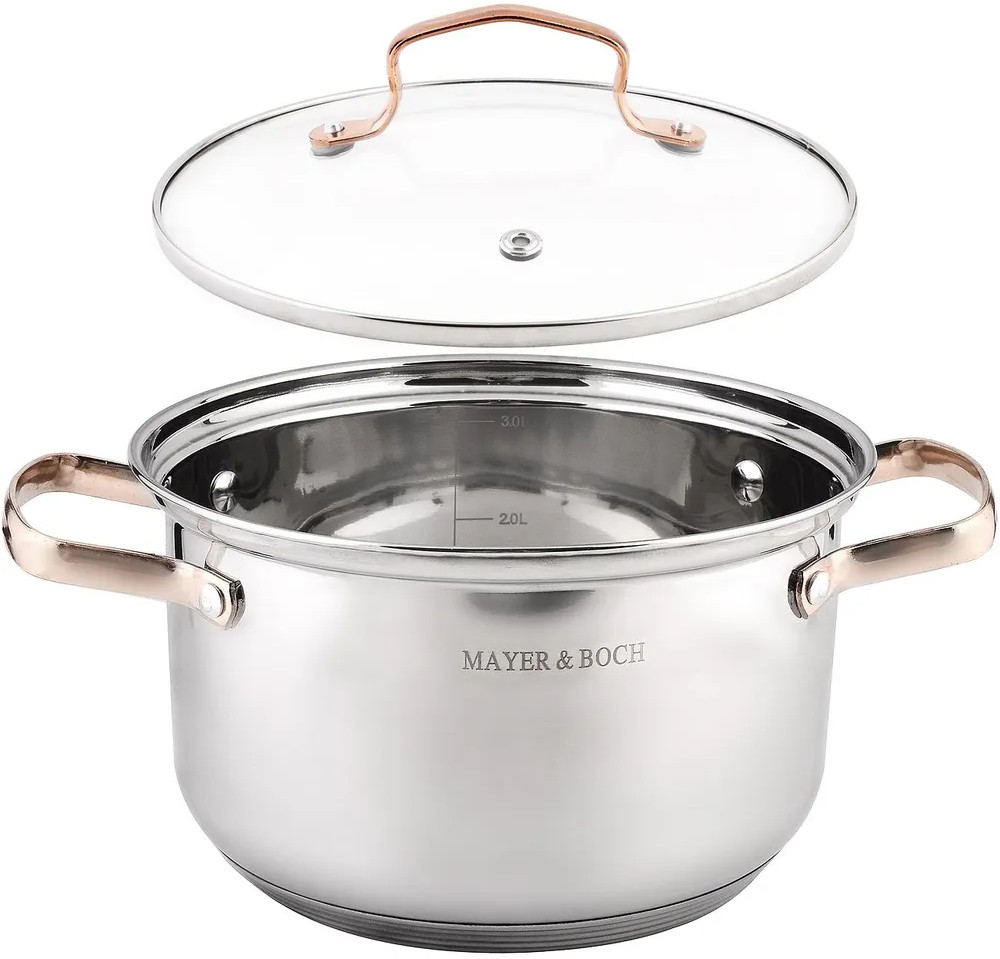 Набор кастрюль Mayer & Boch изготовлен из высококачественной многослойной нержавеющей стали, которая обеспечит быстрый нагрев продуктов и надолго сохранит тепло. Этот набор кастрюль предназначен для здорового и экологичного приготовления пищи. Удобные не нагревающиеся стальные ручки, стеклянная крышка с паровыпуском и стальным ободом, и зеркальная поверхность кастрюль с гравировкой, сделают приготовление пищи не только удобным и качественным, но и комфортным и эстетичным. Также изделия снабжены внутренней шкалой литража. Дно кастрюль индукционное, толщина стенок 0,43 мм. |