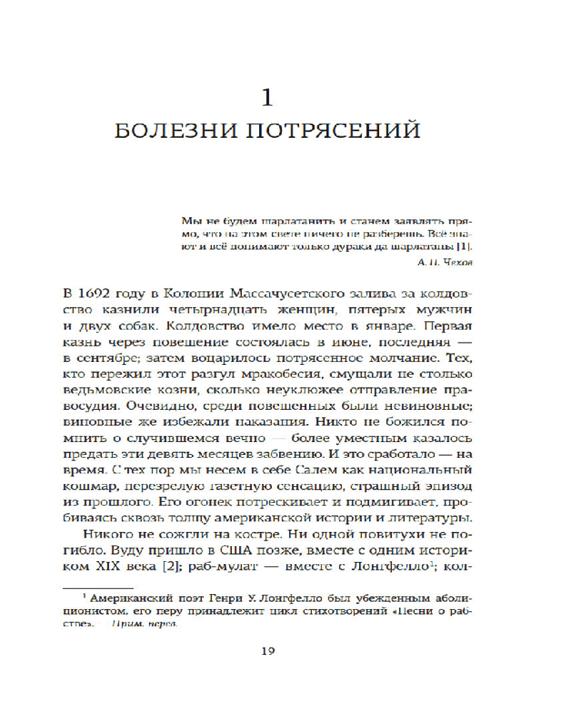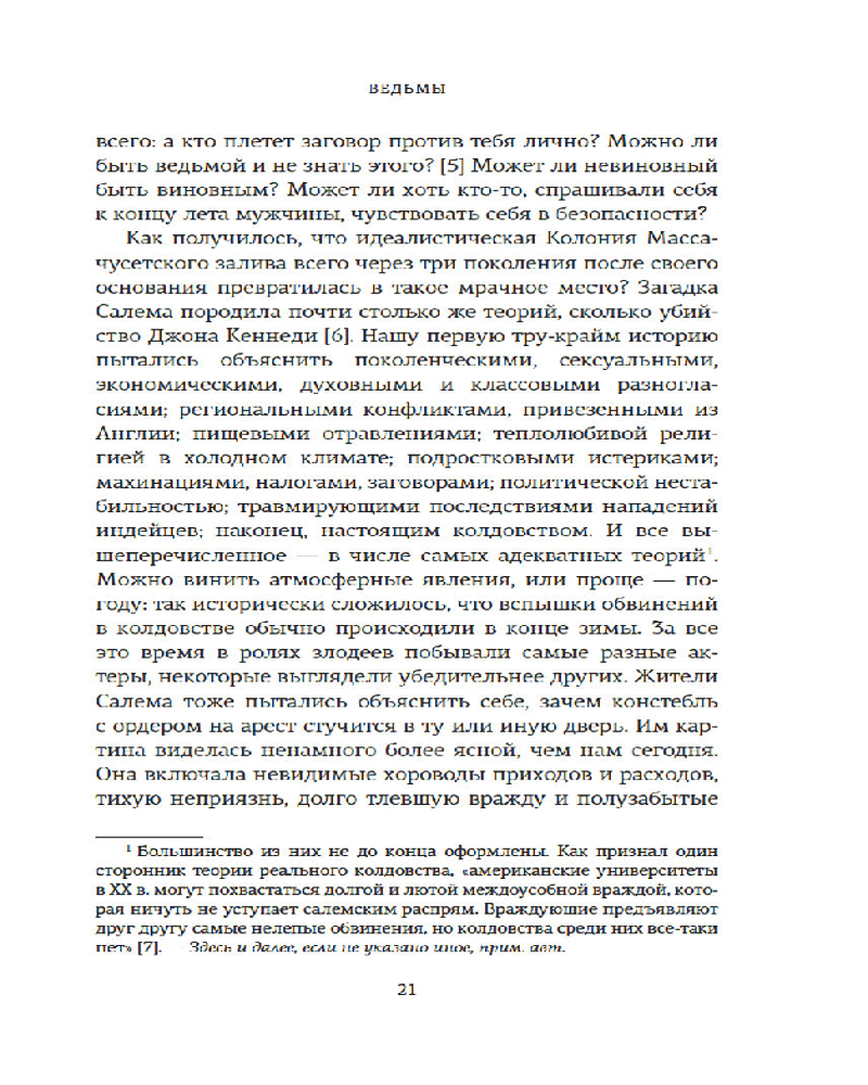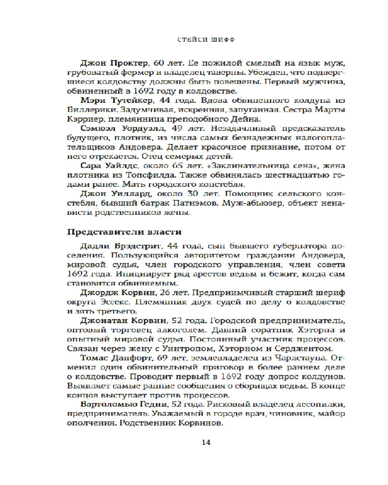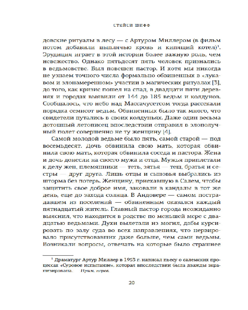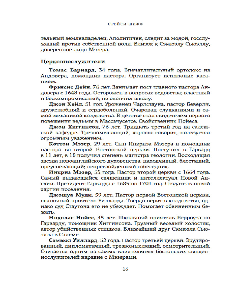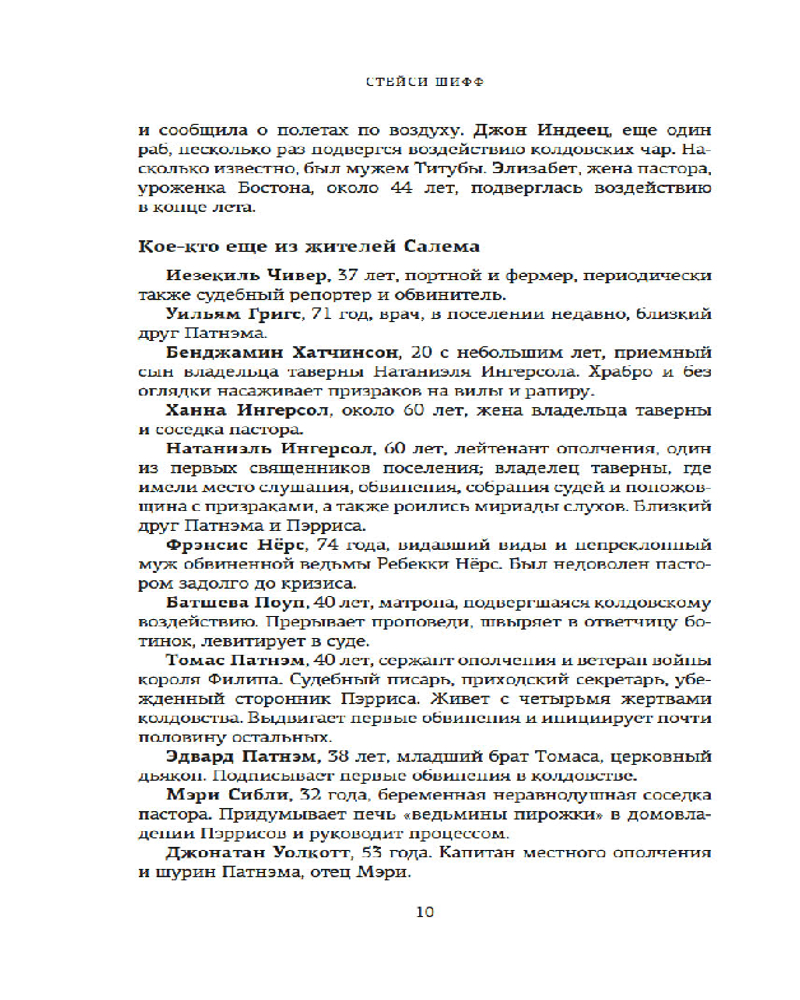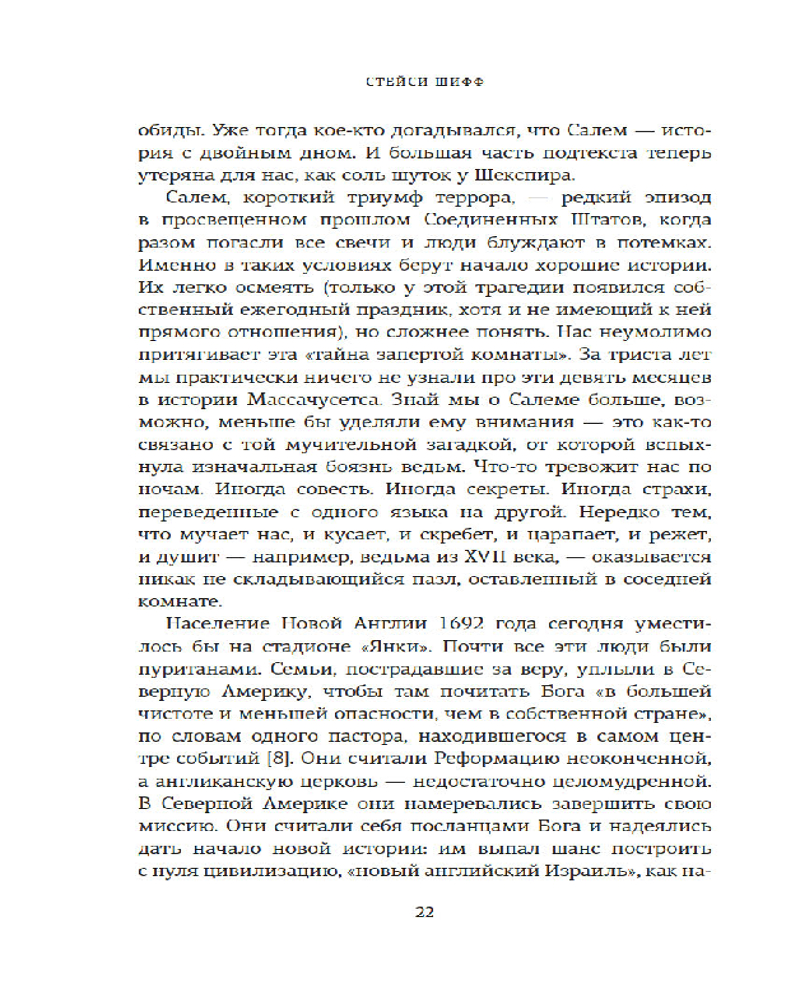 Что же это было — пережиток средневековых гонений, объявший весь город массовый психоз? Стейси Шифф, выдающийся историк и блестящий рассказчик, лауреат Пулитцеровской премии, приоткрывает завесу тайн, на протяжении нескольких столетий окутывавших Салем. Впервые обстановка, сложившаяся в штате Массачусетс в конце XVII века, исследуется настолько глубоко и подробно, а преследование ведьм воссоздается настолько полно и психологически точно. В талантливом изложении Шифф салемские события предстают перед читателем настоящим детективным расследованием, одинаково важным для науки и увлекательным для широкого круга читателей. |