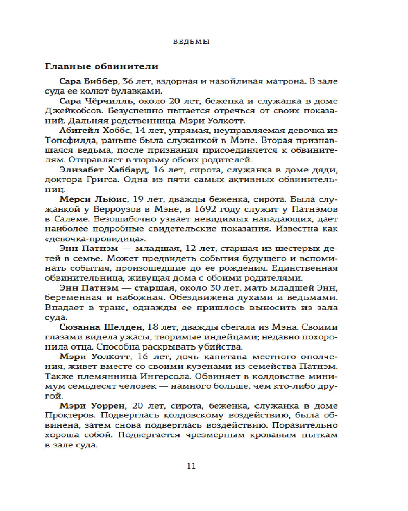 Охота на ведьм в Салеме — это последний отголосок Средневековья в наступившей новой эпохе, уникальное историческое событие, которое легло в основу многих фильмов и художественных романов, и, без сомнения, самый знаменитый ведьмовской процесс в мире. В нем были замешаны и простые жители, и известные политики Новой Англии: беда не обошла стороной никого — даже священник не избежал виселицы. Все ополчились друг на друга: соседи обвиняли соседей, родителей, детей друг друга.