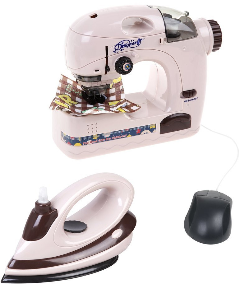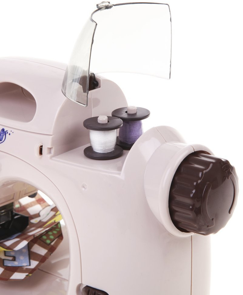 Швейная машинка включается/выключается с помощью кнопки-переключателя «On/Off». Иголкой машинки можно делать настоящие стежки, зажав кусочек ткани под швейной лапкой, заправив нитки и нажимая на педаль, присоединенную проводом. При включении игрушки загорается подсветка. В комплекте прилагаются 2 катушки с белыми нитками и 2 кусочка ткани. Если прислонить утюг к твердой поверхности, он будет вибрировать. В верхней части корпуса игрушки расположено небольшое отверстие. В него можно налить немного воды и брызгать ей из пульверизатора.