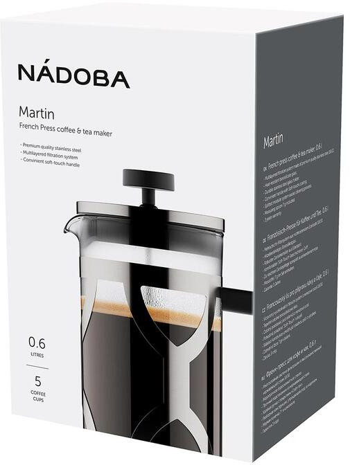 Френч-пресс «Martin» состоит из жаропрочной стеклянной колбы объемом 600 мл и стального подстаканника, устойчивого к образованию коррозии. Вся конструкция модели легко разбирается, что облегчает процесс очистки. Модель можно мыть в посудомоечной машине. Внутри размещен металлический фильтр для отделения напитка от заварки. Ручка выполнена из приятного на ощупь материала, который не нагревается в процессе использования френч-пресса и не скользит в руках.