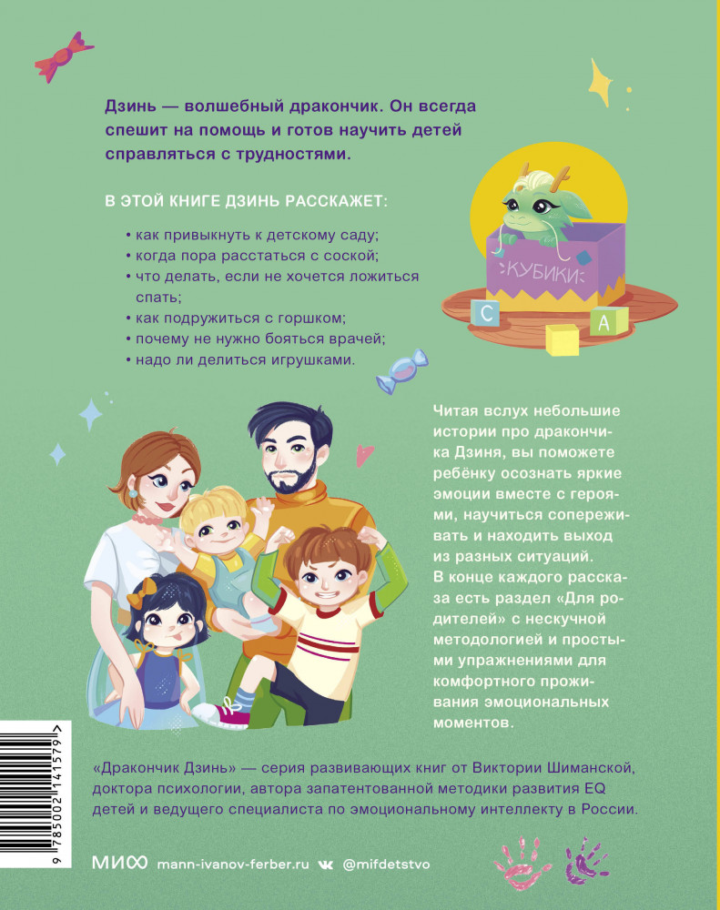 💳 Оплатить за товар можно при получении 🇰🇿 Есть бесплатная доставка по Казахстану 🎁 Копите бонусы с каждой покупки Первая книга новой серии развивающих книг от эксперта в области эмоционального интеллекта Виктории Шиманской. Истории для чтения вслух о самых важных вопросах дошкольников и младших школьников с пояснениями для родителей. Максу скоро два года. У него есть папа, мама, а ещё старшие брат и сестра, Дэн и Софи. Однажды в их доме появился неожиданный гость — волшебный дракончик Дзинь. Он знает, когда пора прощаться с соской, как подружиться с горшком, почему не надо бояться врачей и что делать, если не хочется есть папин суп. Дзинь — мудрый дракон из древней драконьей династии. |