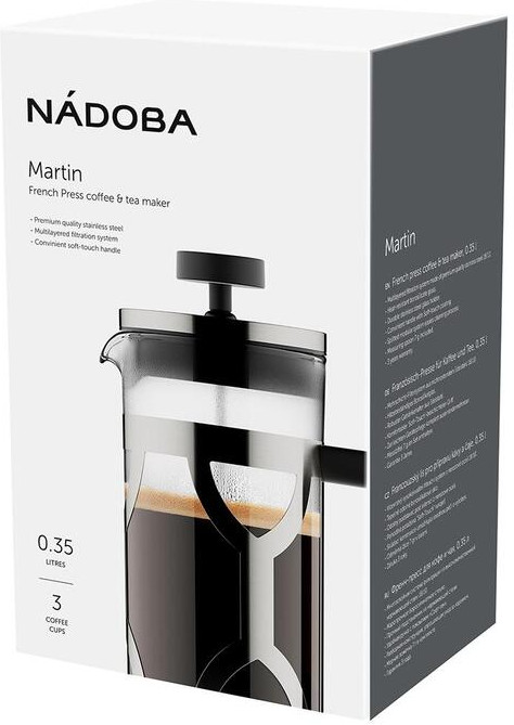 Френч-пресс «Martin» состоит из жаропрочной стеклянной колбы объемом 350 мл и стального подстаканника, устойчивого к образованию коррозии. Вся конструкция модели легко разбирается, что облегчает процесс очистки. Модель можно мыть в посудомоечной машине. Внутри размещен металлический фильтр для отделения напитка от заварки. Ручка выполнена из приятного на ощупь материала, который не нагревается в процессе использования френч-пресса и не скользит в руках.