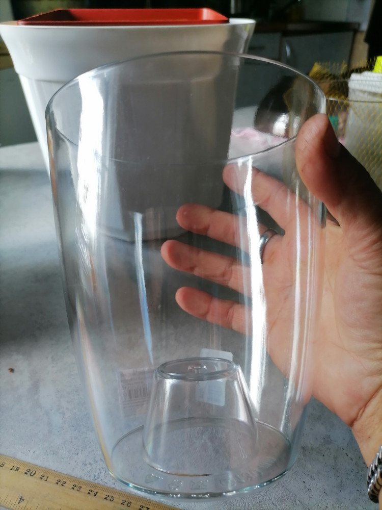 Отличный внешний горшок для орхидей. Внутрь вставляю прозрачный транспортировочный горшок с отверстиями. Удобно поливать замачиванием в таком кашпо.