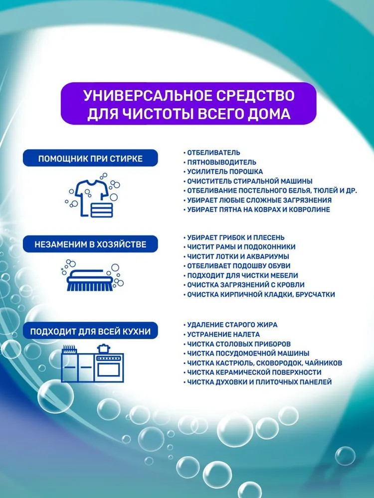 Clean&Fresh Универсальный кислородный очиститель пятновыводительмногофункциональный отбеливает моет посуду выводит пятна В данный момент этот товар отсутствует в продаже. Возможно, у нас найдется аналогичный или похожий товар здесь. Представляет собой новую формулу для выведения пятен кофе, чая, жира, вина, уличной грязи, травы, ягод, сока, крови и т.п. Не содержит хлор, эко пятновыводитель. Эффективен даже при низкой температуре от 30 градусов, восстанавливает белый цвет ткани, удаляет самые стойкие пятна, 100 процентов биоразлагаем, не остается на ткани после полоскания, подходит для ручной и машинной стирки. Не используйте средство для шерсти, шелка и кожи, а также для цветного белья. Избегайте попадания на пуговицы и металлическую фурнитуру. |