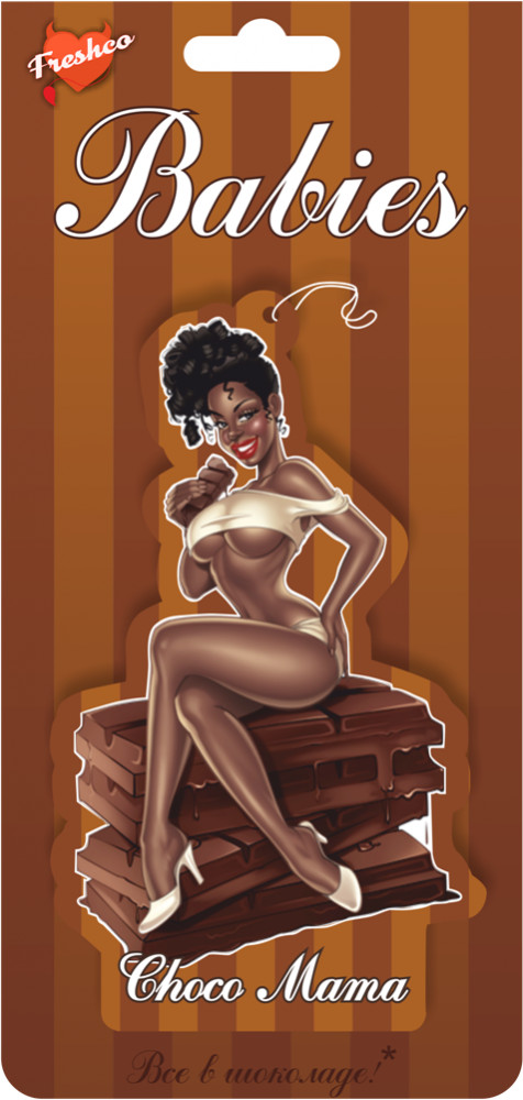 Эксклюзивные картонные ароматизаторы с ярким дизайном и аппетитными ароматами. С эластичным подвесным креплением. После вскрытия аромат сохраняется в течение 2 месяцев. Освежитель подвесной сухой Choco Mama Шоколад — чувственные и волнующие, задорные и эмоциональные pin-up девушки — этот стиль подвесных ароматизаторов «Babies» никого не оставит равнодушным!