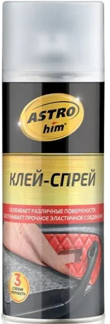 Клей-спрей — высококачественный аэрозольный клей для склеивания между собой в любых комбинациях тканных, нетканых, в том числе пористых материалов (натуральной и искусственной кожи, тканей, войлока, картона, бумаги, резины, поролона, минеральной ваты и др.), дерева, пластиков, а также приклеивания их на твердые несущие поверхности из пластика, металла, дерева, стекла и проч. Может использоваться в ремонте сидений и обивки салона, для оклейки корпусов сабвуферов и музыкальных полок, для приклеивания элементов отделки в автомобиле, при монтаже шумо- и теплоизоляции.
