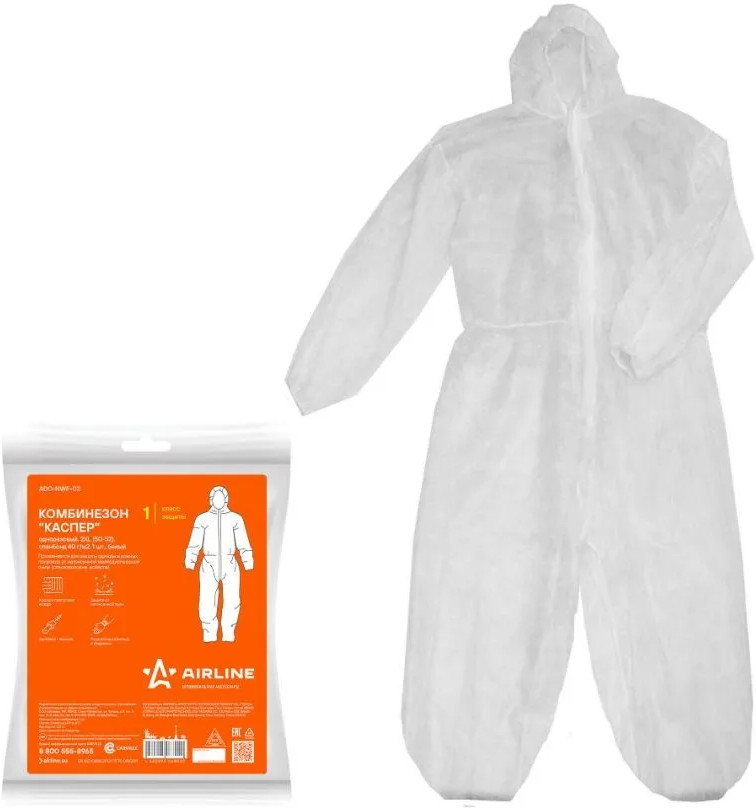 Комбинезон одноразовый Airline «Каспер» спанбонд 40 гр/м² размер 2XL(50-52) Белый- Комбинезоны одноразовые «Каспер», которые предназначены для защиты одежды или кожного покрова при работе с различными веществами. Представляет собой комбинезон с капюшоном и изготовлен из хорошо вентилируемого нетканого материала, имеет резинки на запястьях, лодыжках и капюшоне для лучшего прилегания к телу. Комбинезон одевается поверх легкой рабочей одежды и застегивается на молнию. Применяется при малярных, подготовительно-зачистных, ремонтных и других видах работ.