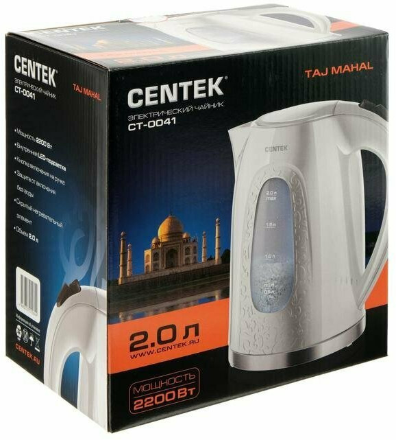 Стильный чайник Centek СТ-0041 объемом 2 л и мощностью 2200 Вт кипятит воду за несколько минут. Прибор имеет скрытый нагревательный элемент для безопасного кипячения воды. Материал корпуса — высококачественный пластик. Пластиковая ручка чайника не перегревается и не скользит в ладони во время использования. Сливной носик обеспечивает удобное переливание воды. Плотно прилегающая к корпусу крышка обеспечивает герметичность при закипании. Она открывается одним нажатием кнопки на ручке, что помогает избежать контакта кожи с паром.