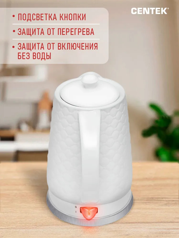 💳 Оплатить за товар можно при получении 🇰🇿 Есть бесплатная доставка по Казахстану от 1 дня 🎁 Копите бонусы с каждой покупки Чайник Centek CT-0061 — качественное и надежное изделие объемом 2 л и мощностью 2000 Вт, которое кипятит воду за несколько минут. Скрытый нагревательный элемент дает ряд весомых преимуществ перед моделями с открытой спиралью. К ним относятся: увеличенная теплоотдача, более быстрый нагрев воды и меньшая склонность к образованию накипи. Корпус и крышка выполнены из керамики, подставка с отделкой из нержавеющей стали. |