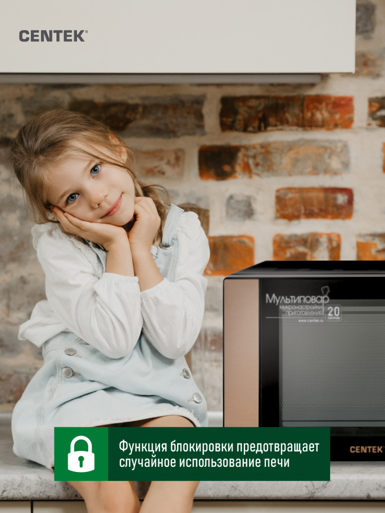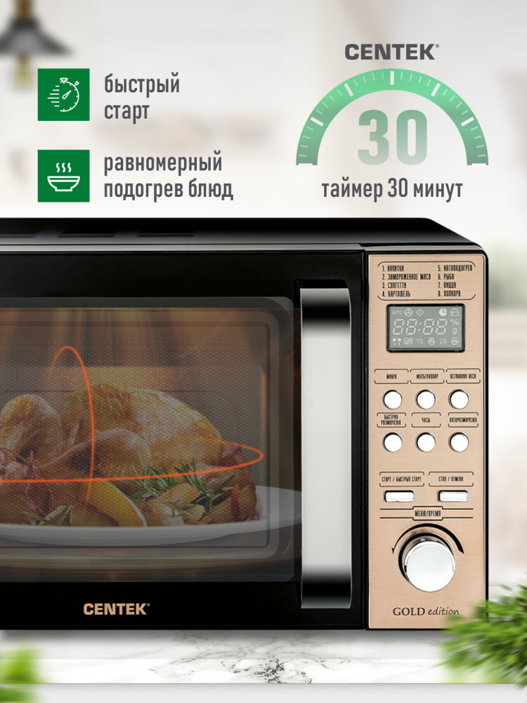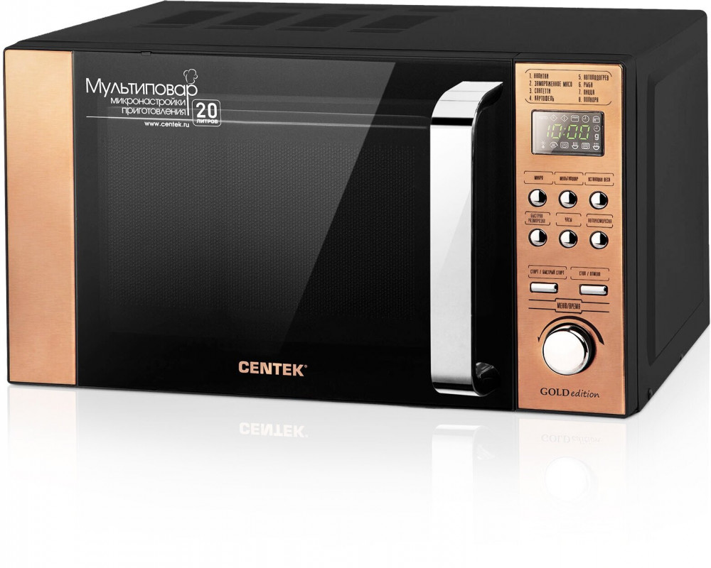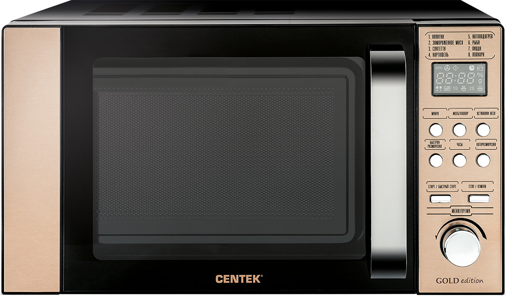Стильная микроволновая печь Centek CT-1584 благородного золотого цвета и хромированной отделкой — незаменимый помощник на любой современной кухне. Способна выполнять задачи по приготовлению, подогреву и размораживанию продуктов. Поддерживает 8 автоматических программ приготовления, функцию мультиповар (приготовление блюд в несколько этапов), имеет электронное управление и LED-дисплей. Благодаря технологии эффективного распределения волн печь равномерно и практически бесшумно прогревает пищу.