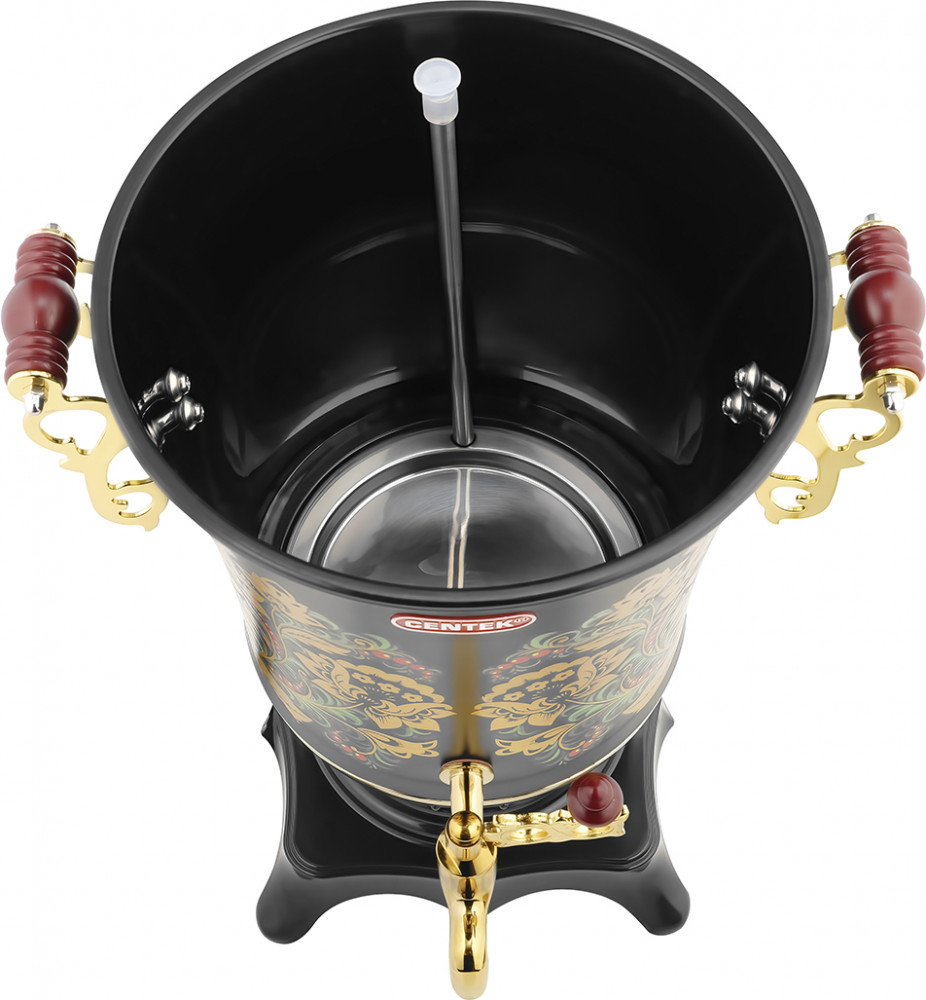 Самовар Centek CT-0092 — оригинальное, качественное и надежное изделие объемом 4 литра и мощностью 2100 Вт, которое кипятит воду за несколько минут. Скрытый нагревательный элемент дает ряд весомых преимуществ перед моделями с открытой спиралью. К ним относятся: увеличенная теплоотдача, более быстрый нагрев воды и меньшая склонность к образованию накипи. Корпус и крышка выполнены из высококачественного материала. Удобные ручки самовара не перегреваются и не скользят в ладонях во время использования.