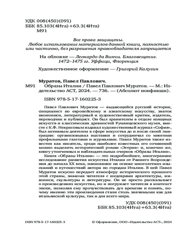 💳 Оплатить за товар можно при получении 🇰🇿 Есть бесплатная доставка по Казахстану от 1 дня 🎁 Копите бонусы с каждой покупки Серия: Абсолют нонфикшн Павел Павлович Муратов — выдающийся русский историк, специалист по европейскому и азиатскому искусству, знаток иконописи, литературный и художественный критик, издатель, переводчик и публицист. Он был хранителем в отделе изящных искусств и классических древностей Румянцевского музея, вместе с К.Ф. Некрасовым издавал художественный журнал «София», был активным деятелем в сфере искусства до и после своей эмиграции: организовывал выставки и сотрудничал со многими профильными газетами и журналами. Павел Муратов также известен как писатель, среди наиболее известных его сочинений можно выделить исторический роман «Эгерия» и, конечно же, книгу утонченных и наблюдательных очерков «Образы Италии». |