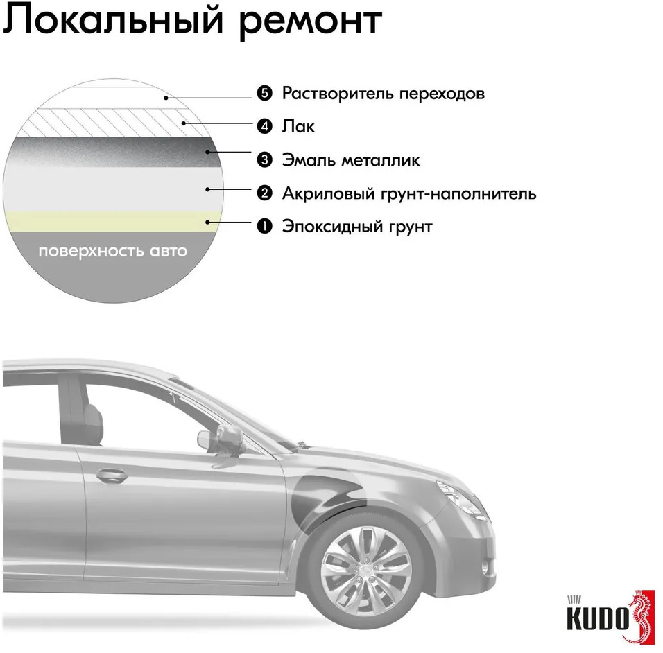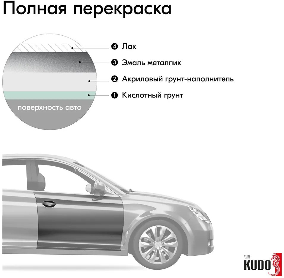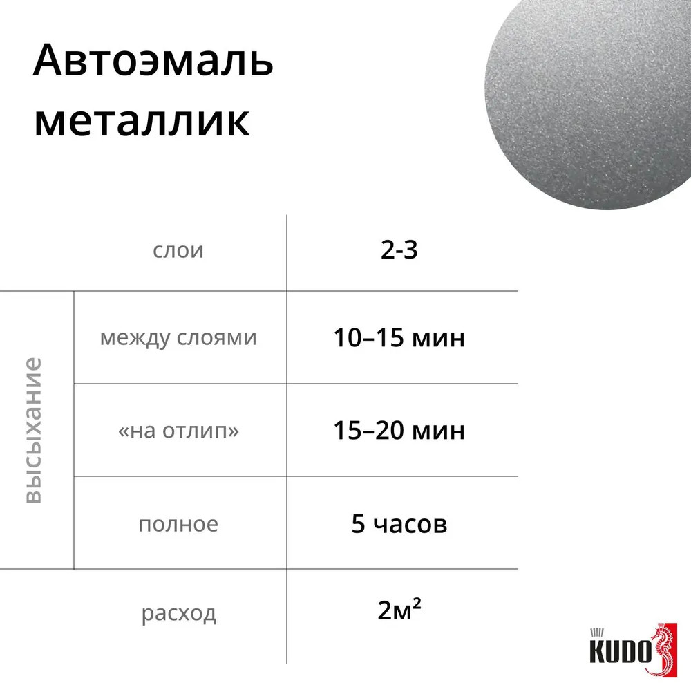Высококачественная металлизированная базовая эмаль KUDO воздушной сушки представляет собой суспензию эффектных и цветных пигментов в растворе полиэфирной, меламиновой смол и ацетобутирата целлюлозы с введением целевых добавок.