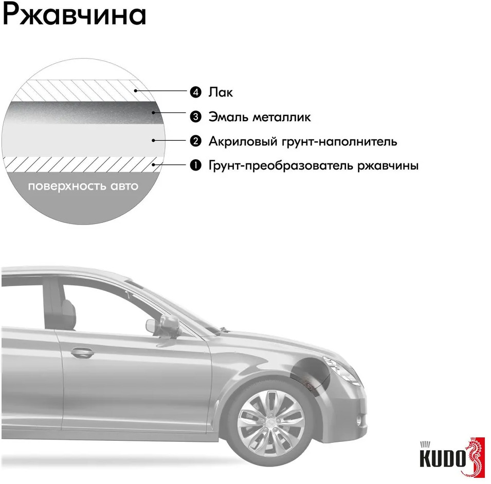 • эмаль не обладает поверхностной прочностью и атмосферостойкостью. Обязательно требуется нанесение защитного слоя прозрачного акрилового лака не ранее, чем через 15‑20 минут после нанесения последнего слоя эмали. Рекомендуется использовать автомобильный акриловый лак KUDO KU-9010.